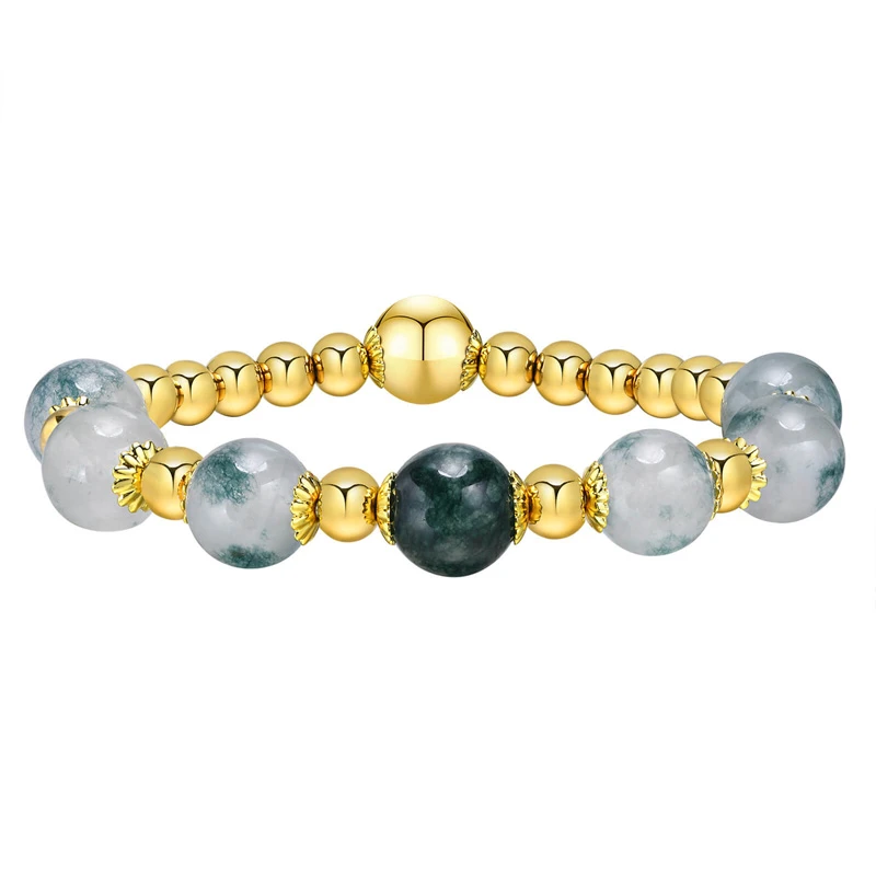 Moderný pružný guličkový náramok z chirurgickej ocele a prírodných kameňov.