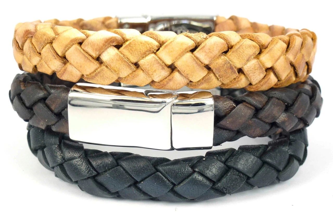 Kožený náramok pre mužov. Náramok tvorí oválny spletenec kože široký 11mm. Masívne oceľové zapínanie má leštený povrch. Dĺžka náramku 21cm. Krásny pánsky kožený náramok.