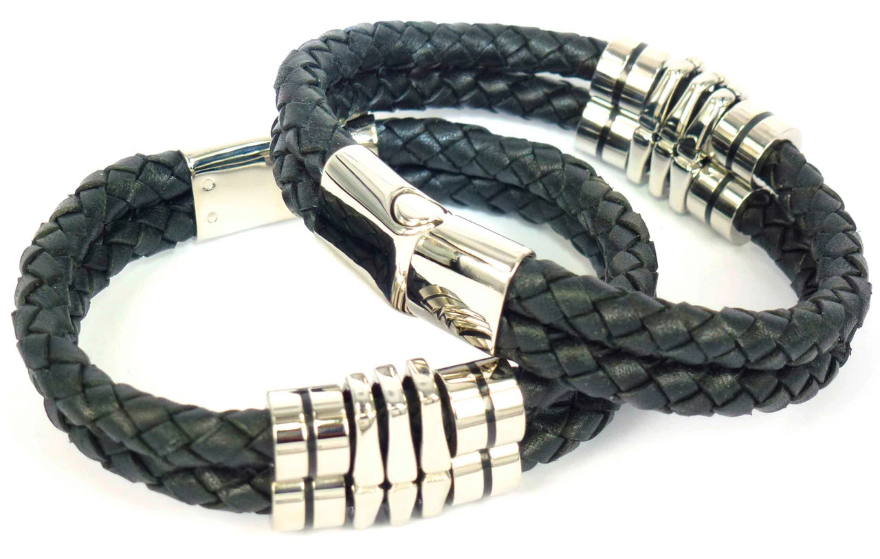 Náramok Bandito. Náramok je kombinácia kože a chirurgickej ocele 316L. Náramok tvoria dva kožené „pramene“ o priemere 6mm. Oceľová ozdoba má rozmer 30×19mm. Oceľové zapínanie má leštený povrch. Pekná kombinácia chirurgickej ocele a kože. Dĺžka náramku 21cm.