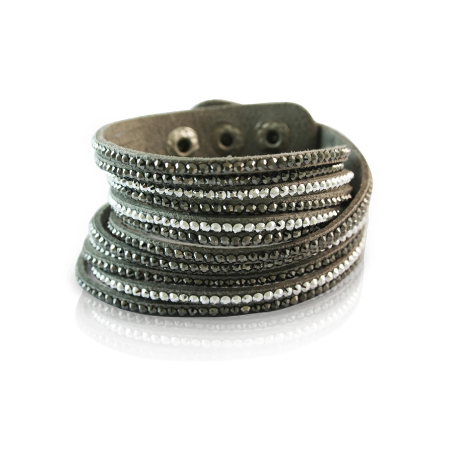 Dámsky náramok z umelej kože ozdobený žiarivými kamienkami. Náramok je možné zapnúť na úrovni dĺžok 17,18,19cm. Náramok je po ovinutí zápästia široký 35 mm.