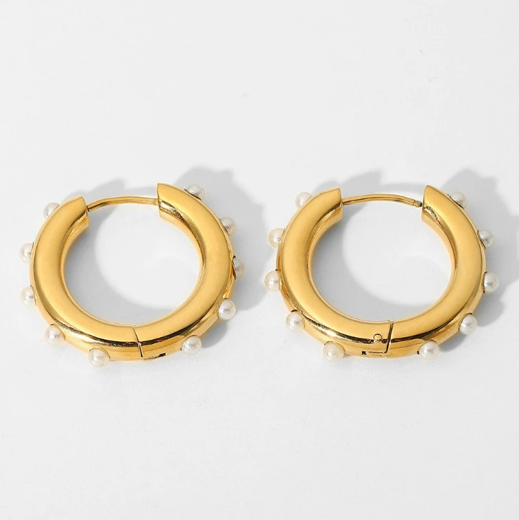 Náušnice z chirurgickej ocele kruhy. Povrch náušníc je pozlátený technológiou PVD. Náušnice sú ozdobené umelými perličkami. Priemer "tela" náušníc 5mm, vonkajší priemer náušníc 30mm. Náušnicové zapínanie je kĺbové.