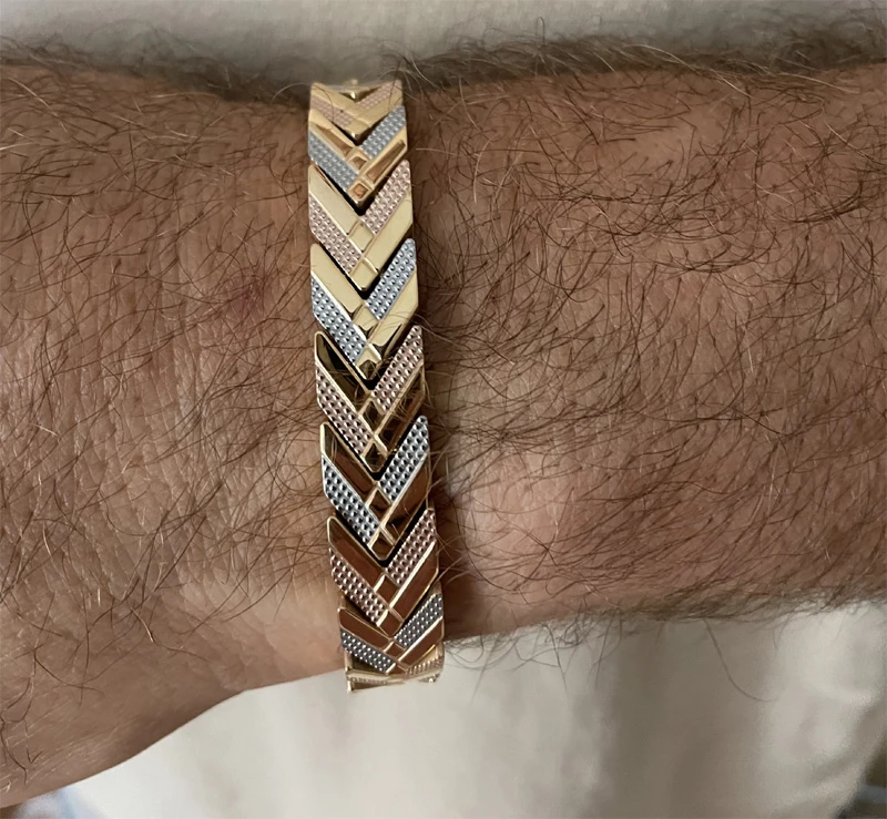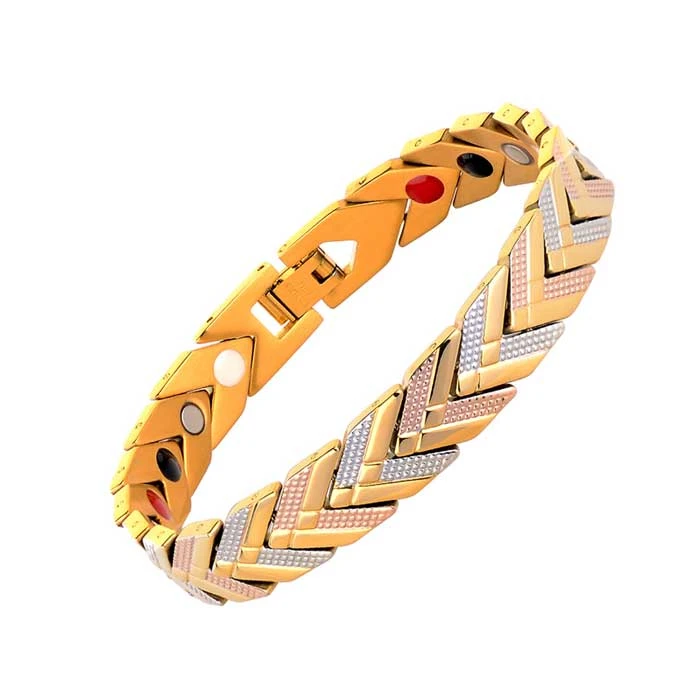 Náramok z chirurgickej ocele s magnetmi. Povrch náramku je pozlátený technológiou PVD. Náramok je široký 11 mm, dĺžka náramku 20,5 cm. Dĺžku náramku je možné na prianie zadarmo skrátiť.