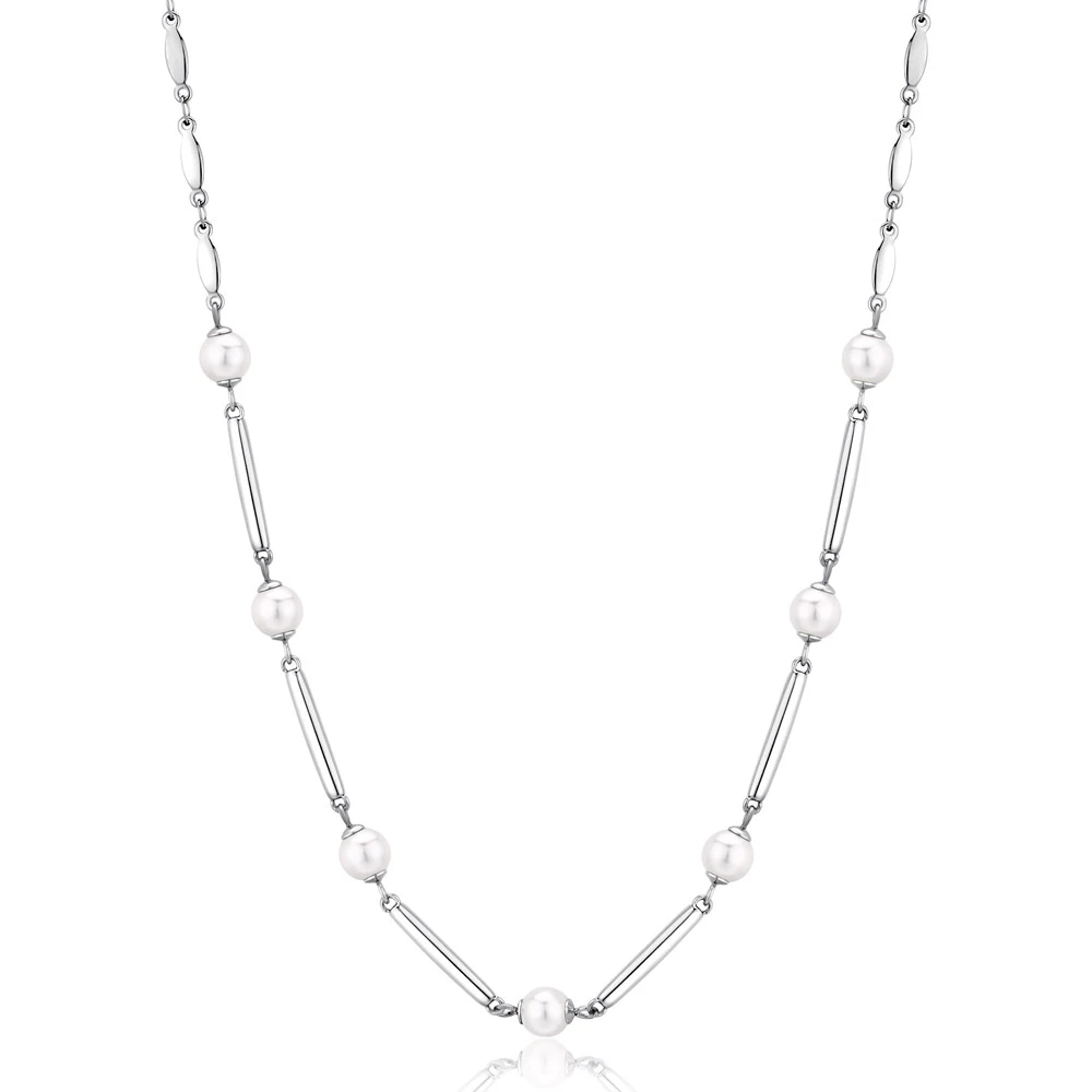Dámsky náhrdelník z chirurgickej ocele z kolekcie Affinty. Náhrdelník je kombinácia ušľachtilej ocele a umelých perál. Šperky vyrobené z chirurgickej ocele sú odolné proti poškriabaniu, nemenia farbu, neoxidujú, nevyvolávajú alergické reakcie ani nereagujú na pot a prach. Dĺžka náhrdelníka 47cm.