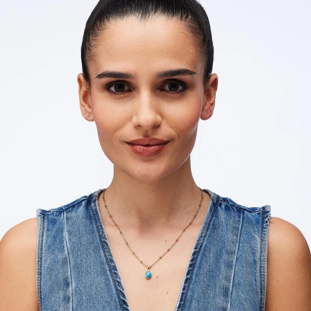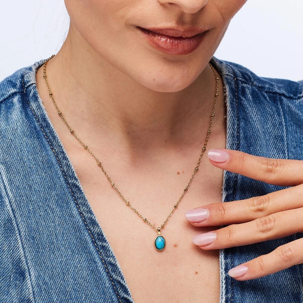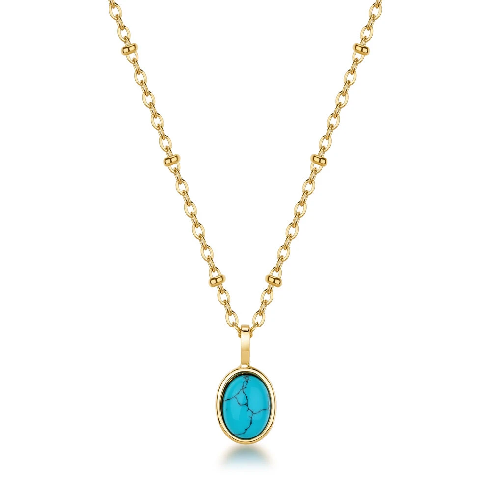 Náhrdelník z chirurgickej ocele s pozláteným povrchom. Náhrdelník je ozdobený rekonštituovaným tyrkysom. Zapínanie náhrdelníka je karabínové. Elegantný dámsky náhrdelník s tyrkysom, ktorý je považovaný za kameň ochrany, pokoja a ženskej sily. Náhrdelník je dlhý 45 cm.