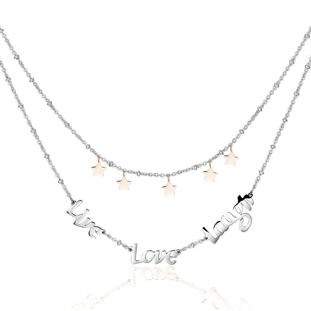 Dvojradový náhrdelník Brosway z kolekcie Script s príveskami v tvare hviezdičiek a výrezom slov "Live-Love-Laugh" - v preklade "Žiť-Milovať-Smiať sa" je vyrobený z chirurgickej ocele je čiastočne pozlátený technológiou PVD. Šperky vyrobené z chirurgickej ocele sú odolné proti poškriabaniu, nemenia farbu, neoxidujú, nevyvolávajú alergické reakcie ani nereagujú na pot a prach. Náhrdelník je dlhý 43 cm.