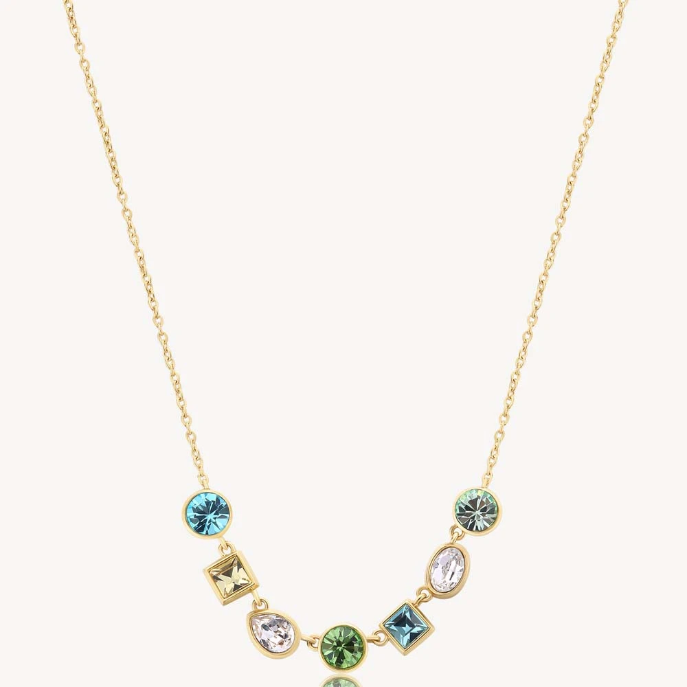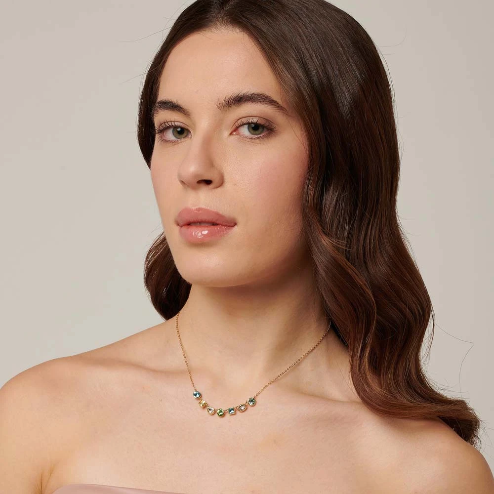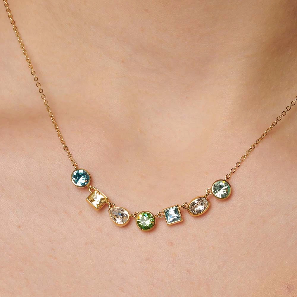 Dámsky náhrdelník z kolekcie Symphonia s príveskami farebných kryštálov z chirurgickej ocele pozlátený technológiou PVD. Šperky vyrobené z chirurgickej ocele sú odolné proti poškriabaniu, nemenia farbu, neoxidujú, nevyvolávajú alergické reakcie ani nereagujú na pot a prach. Dĺžka náhrdelníka 43 cm.