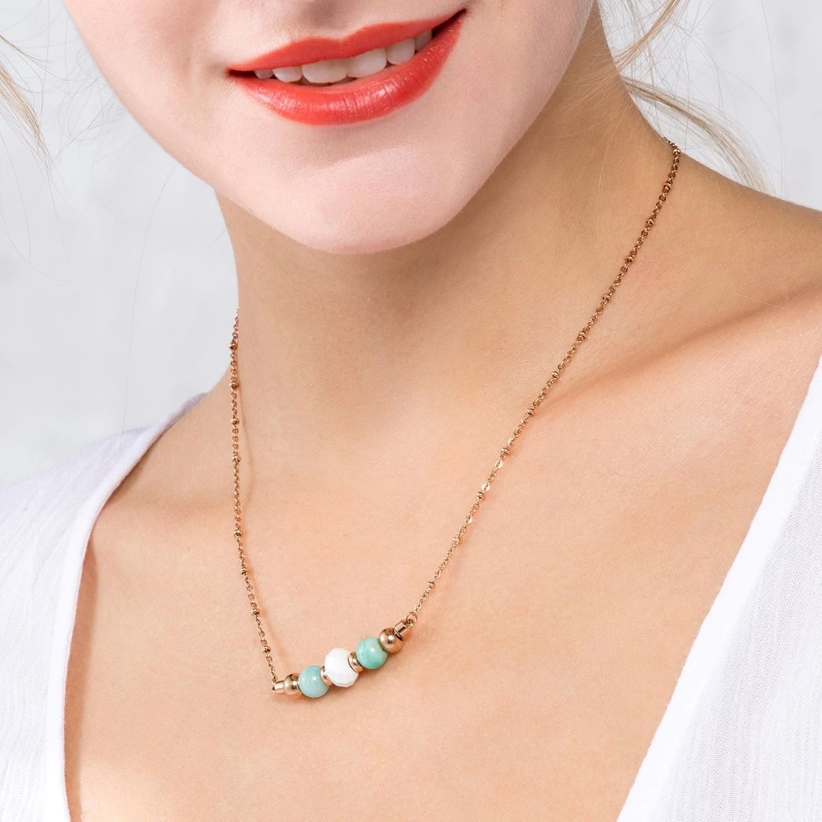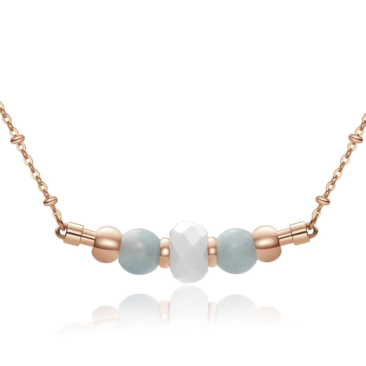 Náhrdelník z chirurgickej ocele ozdobená korálky z amazonitu a achátu. Povrch náhrdelníku je leštený upravený technológiou PVD do farby ružového zlata. Náhrdelník je dlhý 45,5 cm. Zapínanie náhrdelníka je karabínové.