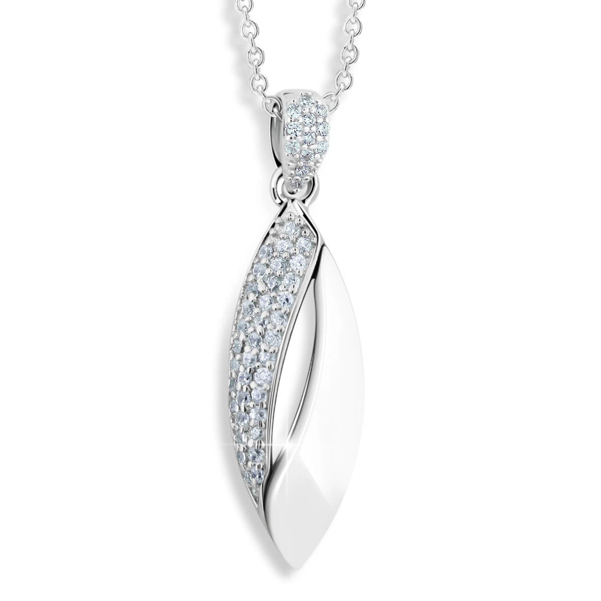 Náhrdelník zo striebra 925/1000 a hi-tech keramiky. Biela keramická časť má hladký lesklý povrch, strieborná časť prívesku a závesné očko sú ozdobené zirkónmi a majú povrch opatrený vrstvou ródia. Úprava rhodiovaním zaručuje dokonalý a dlhotrvajúci vzhľad šperku. Rozmer prívesku: 8x33mm. Náhrdelník je dlhý 44cm.