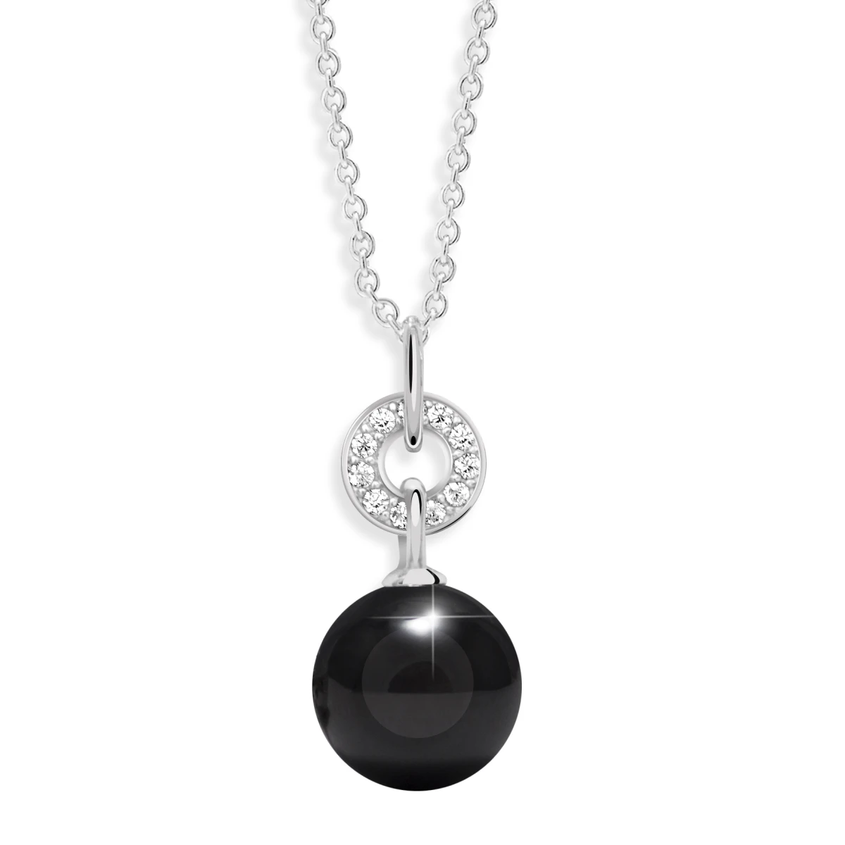 Náhrdelník zo striebra 925/1000 a hi-tech keramiky. Čierna keramická perla má hladký lesklý povrch, strieborná ozdoba so zirkónmi a závesné očko majú povrch opatrený vrstvou ródia. Úprava rhodiovaním zaručuje dokonalý a dlhotrvajúci vzhľad šperku. Priemer keramickej perly 9mm, celková dĺžka prívesku 23mm. Náhrdelník je dlhý 44cm.