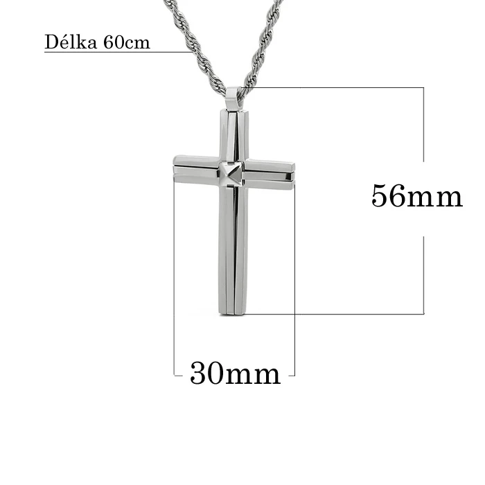 Prívesok kríž a retiazka z chirurgickej ocele. Oceľová retiazka so zapínaním na karabínu je dlhá 60cm, priemer 2,8mm. Rozmer krížika 56x30mm.