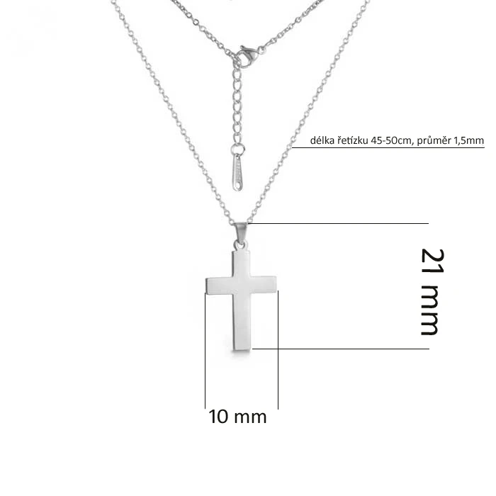 Náhrdelník pre ženy a dievčatá s krížikom. Povrch krížika a retiazky je pozlátený technológiou IP. Rozmer krížika 21x10mm. Retiazka je široký 1,5 mm. Dĺžku náhrdelníka možné nastaviť v rozmedzí 45-50cm