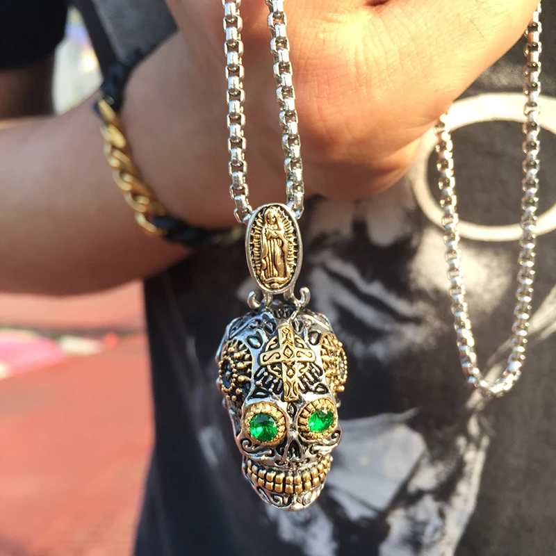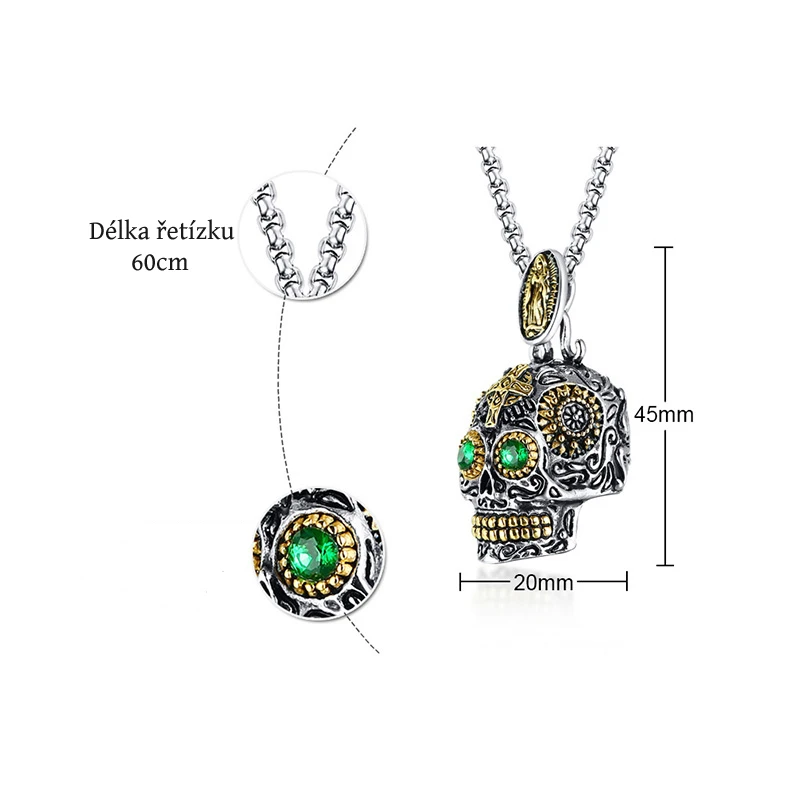 Náhrdelník s lebkou. Ako všetky šperky zhotovené z materiálu chirurgická oceľ, je tiež tento náhrdelník odolný proti poškodeniu, nevyvoláva alergické reakcie, neoxiduje. Chirurgická oceľ nemení farbu. Vďaka týmto vlastnostiam a prijateľnej cene sa oceľové šperky tešia stále značne vysokej popularite v stále sa rozširujúcich radoch spokojných užívateľov.