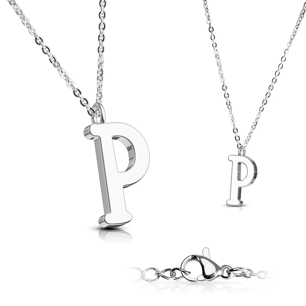 Náhrdelník z chirurgickej ocele s písmenkom P. Náhrdelník má leštený povrch. Písmeno má rozmer 13x7 mm. Písmenko je zavesené na oceľovej retiazke vzoru anker s priemerom 1,6mm. Dĺžku retiazky je možné nastaviť v rozmedzí dĺžok 45-50cm.