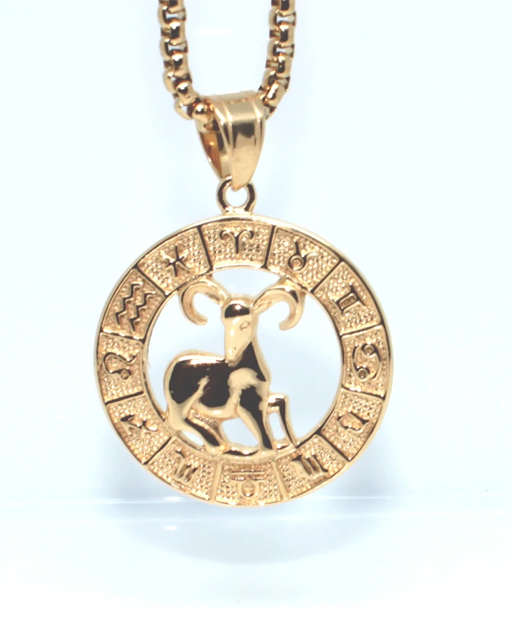 Prívesok so znamením barana (21.3 - 20.4). Prívesok je vyrobený z pozlátenej chirurgickej ocele. Znamenie barana je "lemované" symbolmi ostatných znamení zverokruhu. Súčasťou náhrdelníka je pozlátená retiazka z chirurgickej ocele vzor veneziana so zapínaním na karabínu, dlhý 60cm. Prívesok má priemer 30mm. Na prianie je možné retiazku zadarmo skrátiť.