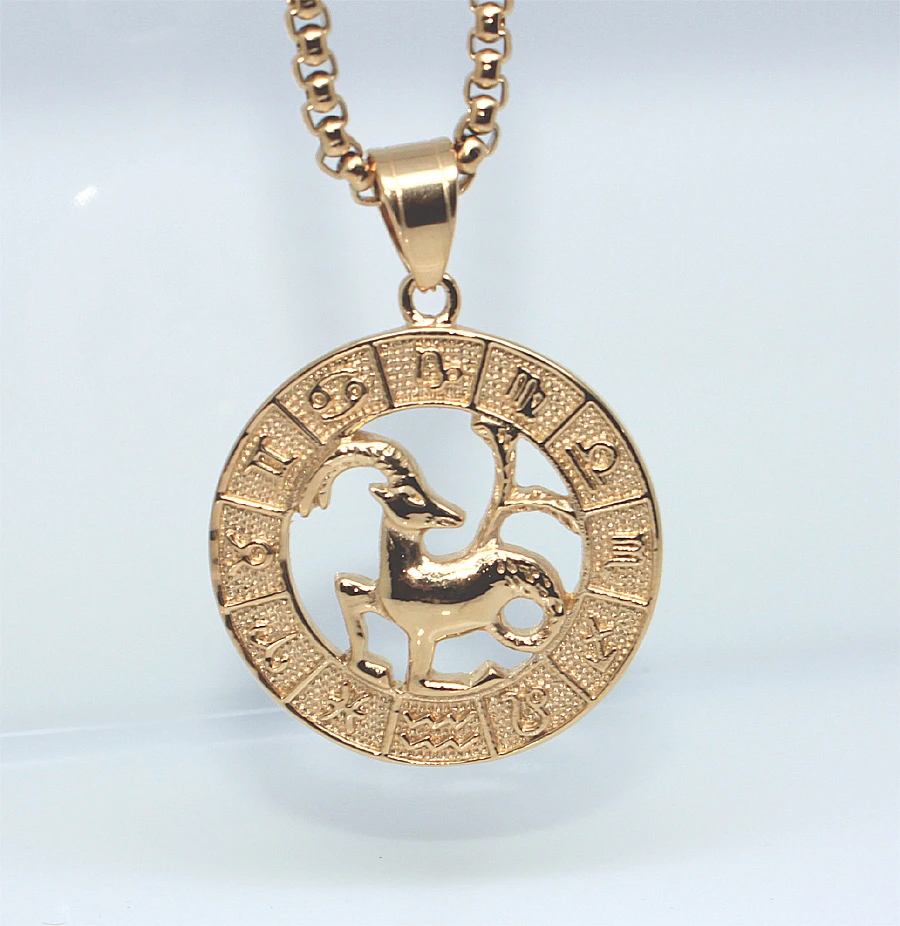 Prívesok so znamením kozorožca (22.12 - 20.1). Prívesok je vyrobený z pozlátenej chirurgickej ocele. Znamenie kozorožca je "lemované" symbolmi ostatných znamení zverokruhu. Súčasťou náhrdelníka je pozlátená retiazka z chirurgickej ocele vzor veneziana so zapínaním na karabínu, dlhý 60cm. Prívesok má priemer 30mm. Na prianie je možné retiazku zadarmo skrátiť.