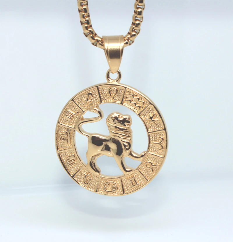 Prívesok so znamením leva (23.7 - 22.8). Prívesok je vyrobený z pozlátenej chirurgickej ocele. Znamenie leva je "lemované" symbolmi ostatných znamení zverokruhu. Súčasťou náhrdelníka je pozlátená retiazka z chirurgickej ocele vzor veneziana so zapínaním na karabínu, dlhý 60cm. Prívesok má priemer 30mm. Na prianie je možné retiazku zadarmo skrátiť.