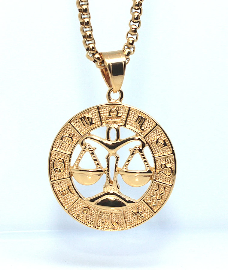Prívesok so znamením váhy (23.9 - 23.10). Prívesok je vyrobený z pozlátenej chirurgickej ocele. Znamenie váh je "lemované" symbolmi ostatných znamení zverokruhu. Súčasťou náhrdelníka je pozlátená retiazka z chirurgickej ocele vzor veneziana so zapínaním na karabínu, dlhý 60cm. Prívesok má priemer 30mm. Na prianie je možné retiazku zadarmo skrátiť.
