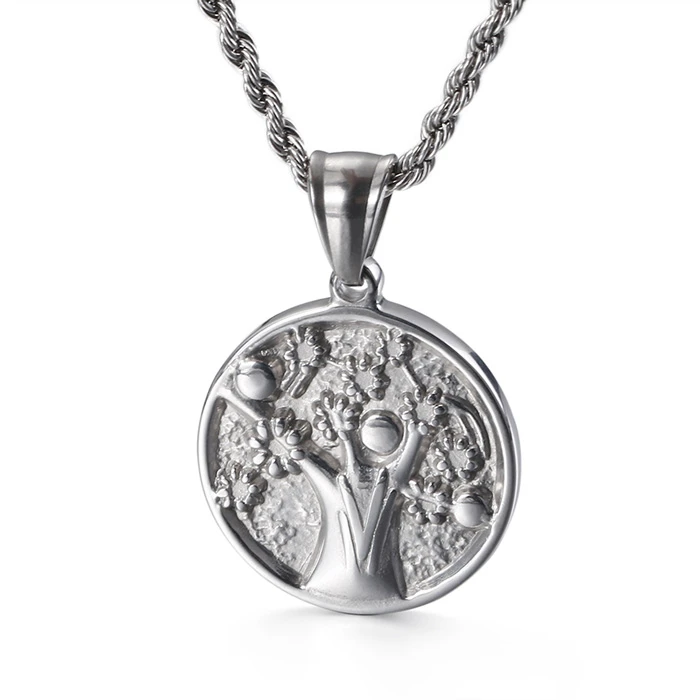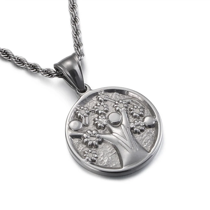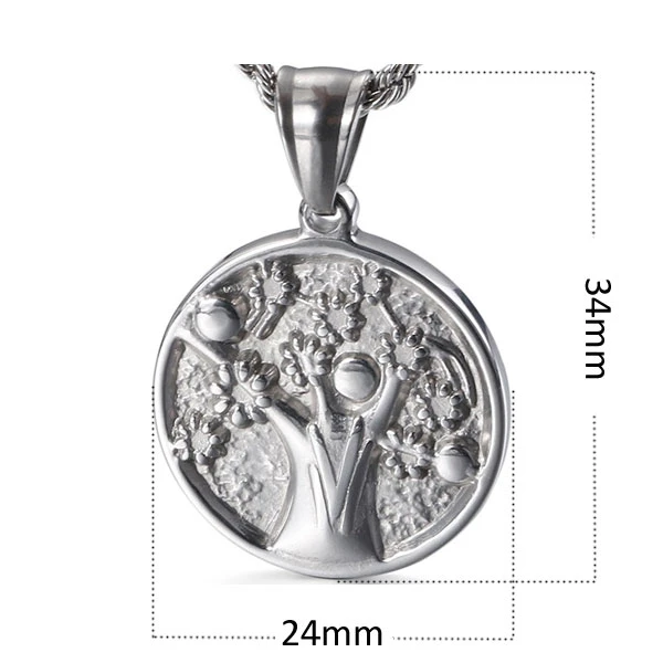 Náhrdelník z chirurgickej ocele strom života. Prívesok so stromom života má priemer 24mm. Oceľový retiazka je dlhý 60cm, šírka retiazky 2,7mm. Náhrdelník má karabínové zapínanie.
