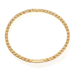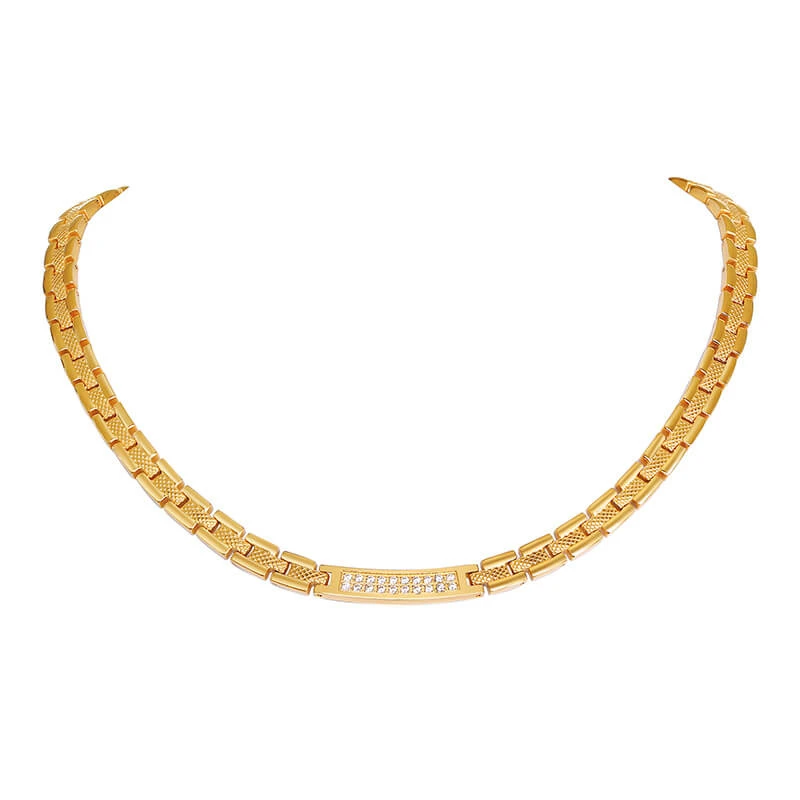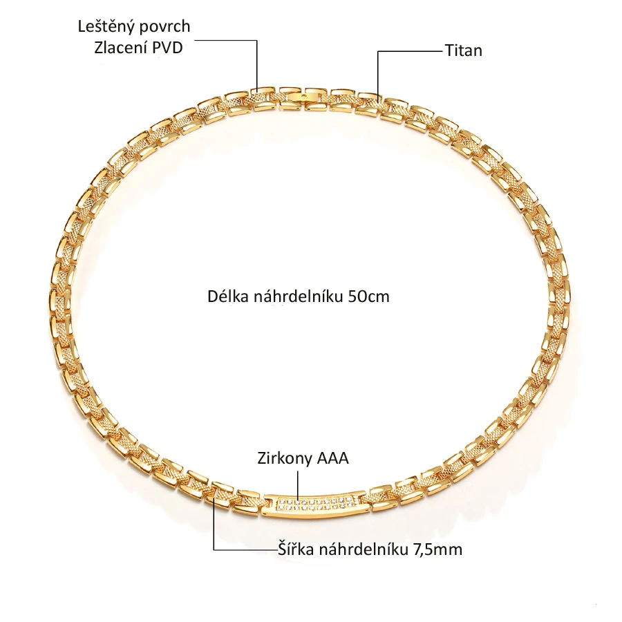 Magnetický náhrdelník z titánu. Náhrdelník má leštený povrch so vzorom. Povrch náhrdelníka je pozlátený technológiou PVD. Dĺžka náhrdelníka 50cm, šírka 7,5mm. Dĺžku náhrdelníka je možné na prianie zadarmo skrátiť.