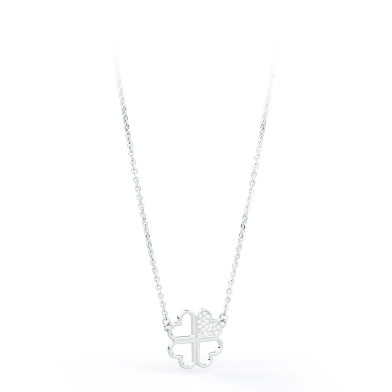 Oceľový náhrdelník so štvorlístkom. Štvorlístok je zložený zo srdiečok. Tri srdiečka sú obrys, štvrté srdiečko je plné osadené zirkónmi. Rozmer štvorlístka 25x24mm, náhrdelník je dlhý 54cm.