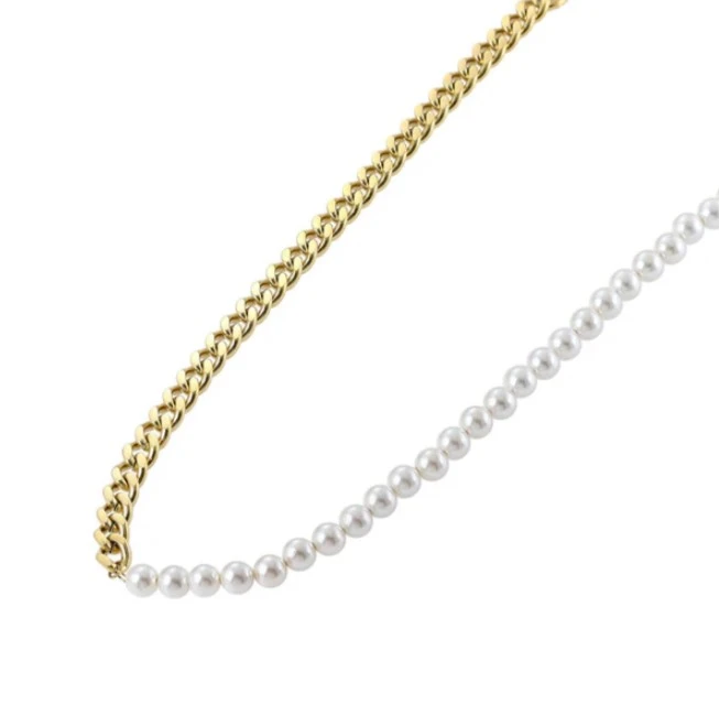 Perlový náhrdelník z chirurgickej ocele a prírodných perál. Povrch oceľových častí náhrdelníka je leštený pozlátený technológiou PVD, biele perličky dodávajú náhrdelníku nádych luxusu. Dĺžka náhrdelníka 50cm. Perličky majú priemer 6mm, retiazková časť náhrdelníka je široká 7mm. Zapínanie náhrdelníka je karabínové.