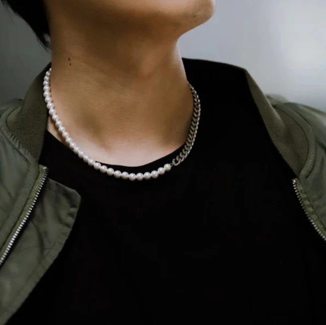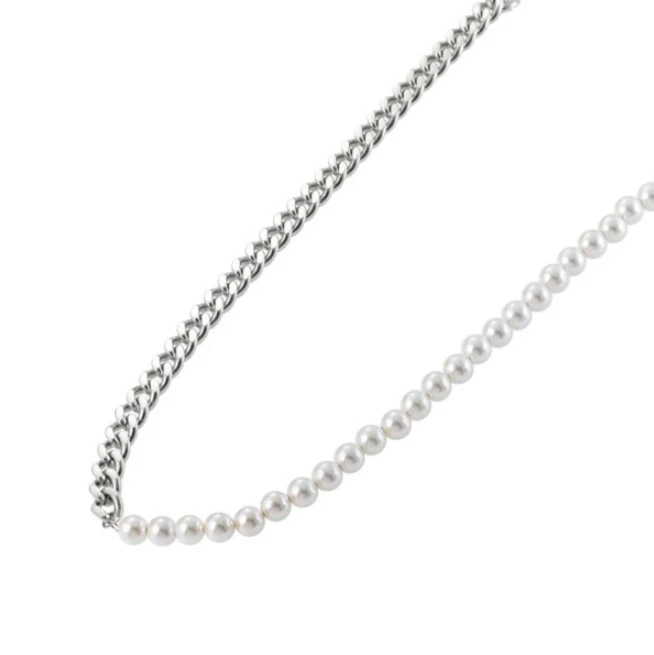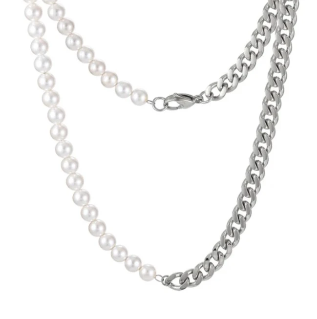 Perlový náhrdelník z chirurgickej ocele a prírodných perál. Povrch oceľových častí náhrdelníka je leštený, biele perličky dodávajú náhrdelníku nádych luxusu. Dĺžka náhrdelníka 50cm. Perličky majú priemer 6mm, retiazková časť náhrdelníka je široká 7mm. Zapínanie náhrdelníka je karabínové.