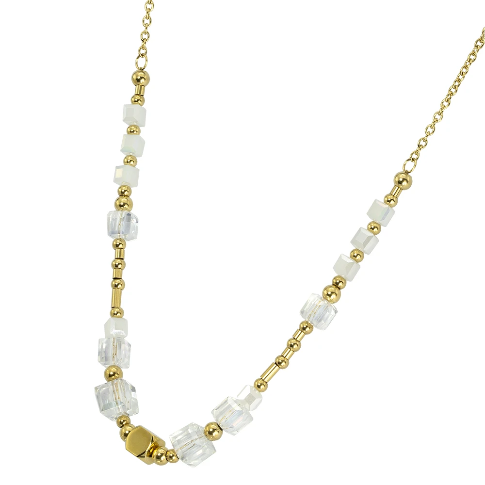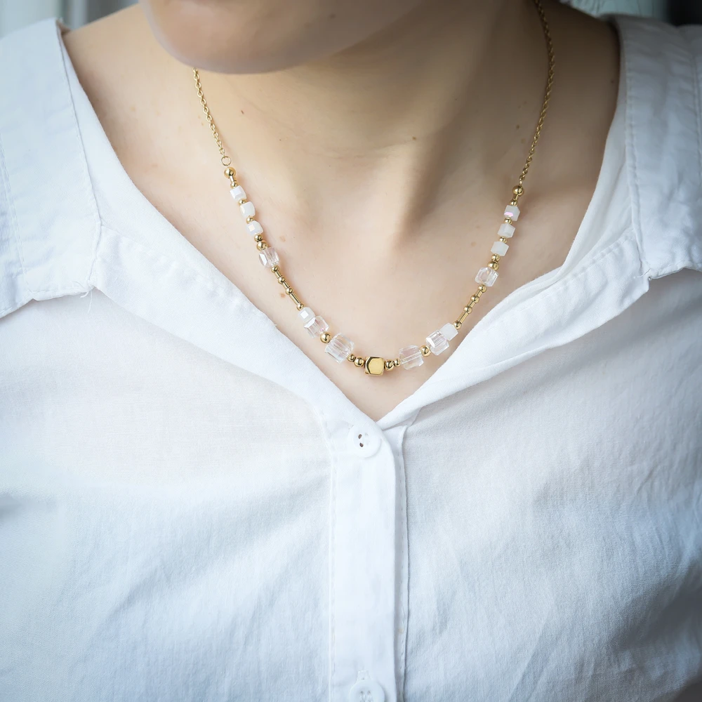 Náhrdelník z pozlátenej chirurgickej ocele a sklenených korálikov. Korálky sú hranaté, väčšie majú rozmer 7x7mm, menšie 6x6mm a 4x4mm. Dĺžku náhrdelníka je možné nastaviť v rozmedzí 45-50cm.