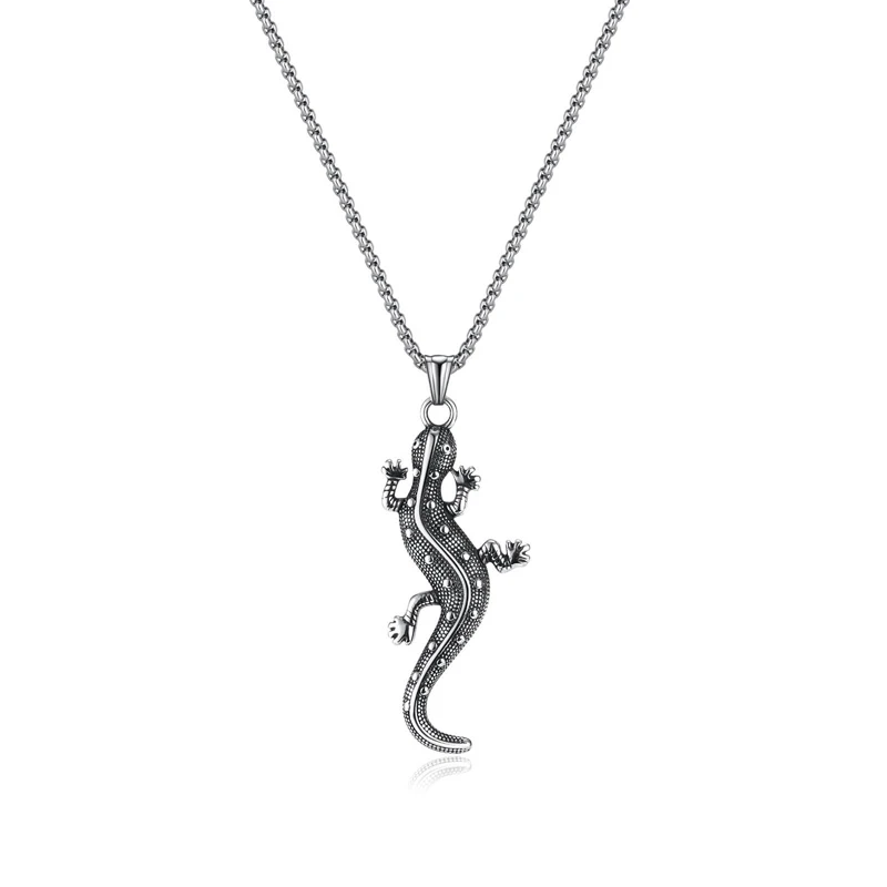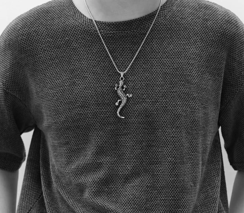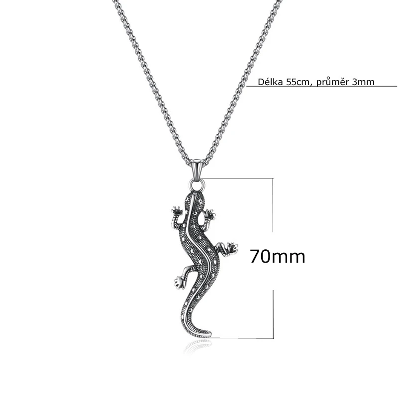 Náhrdelník z chirurgickej ocele s príveskom jašterice. Prívesok jašterice je dlhý 70mm. K prívesku patrí oceľová retiazka s priemerom 3mm, dlhá 55cm.