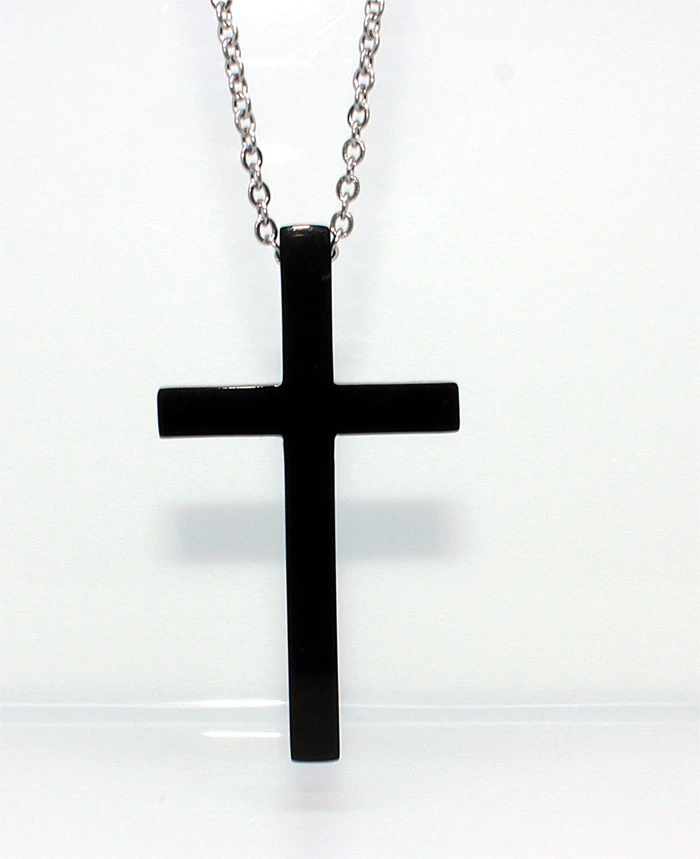 Oceľový prívesok krížik s retiazkou. Povrch krížika je leštený upravený na čiernu technológií IP. Rozmer krížika 54x30mm, dĺžka retiazky 50cm, šírka retiazky 2,4mm. Retiazka má zapínanie na karabínu. Dĺžku retiazky je možné na želanie zadarmo skrátiť.