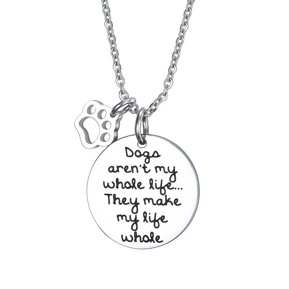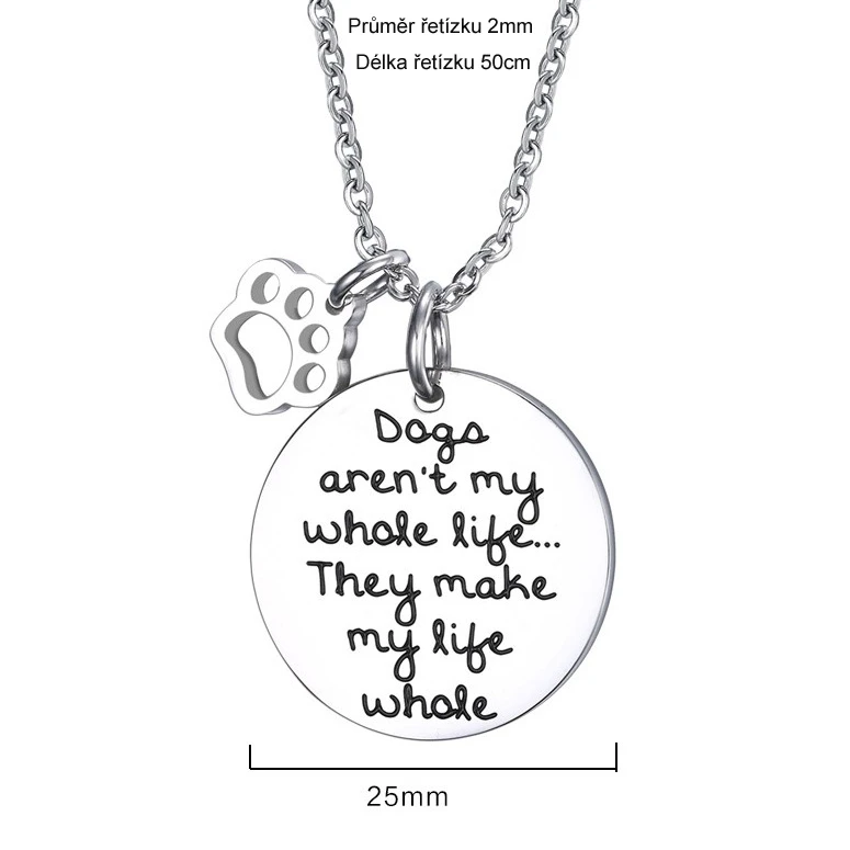 Oceľový náhrdelník pre milovníkov psov. Strana prívesku s nápisom je leštená, opačná strana prívesku je matná vhodná pre vyrytie mena psieho miláčika. Oceľový retiazka so zapínaním na karabínu je dlhý 50cm, priemer retiazky 2mm.