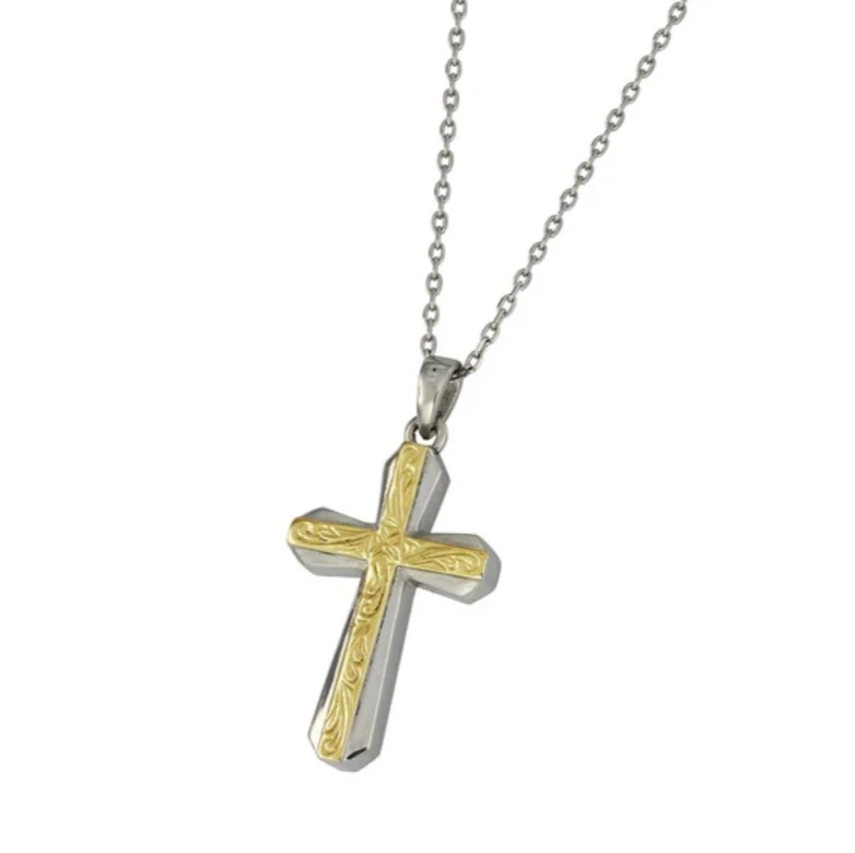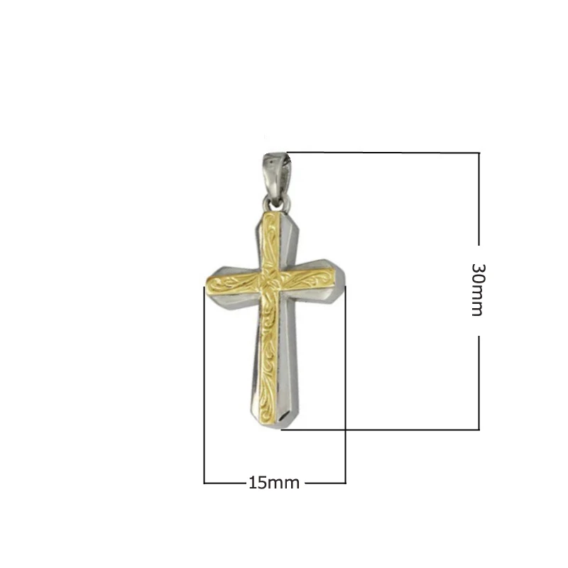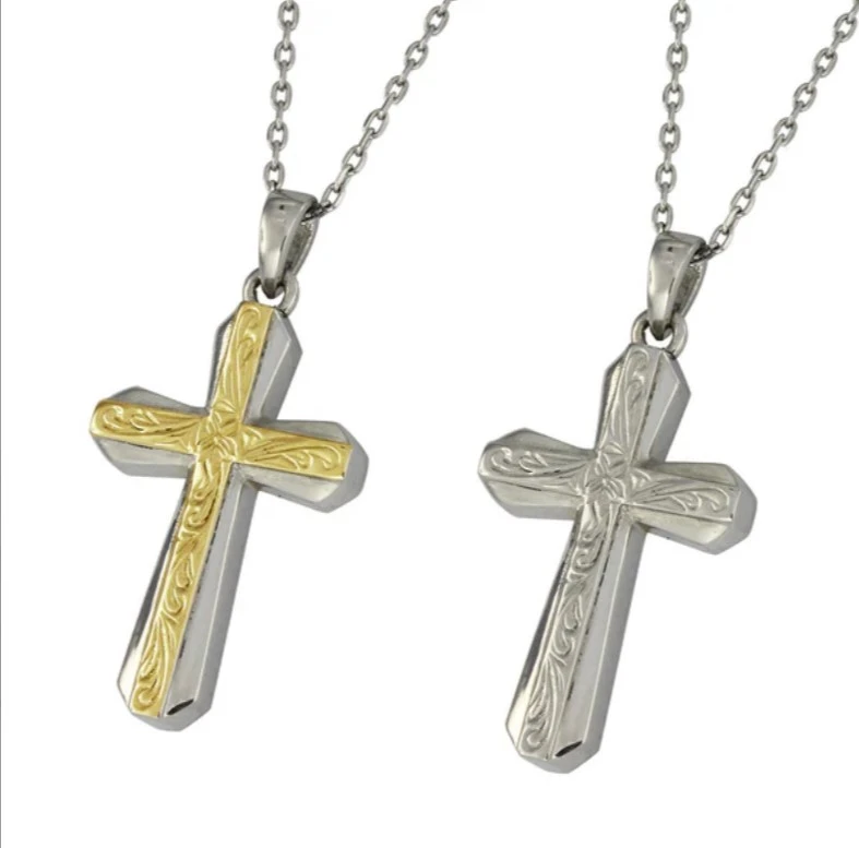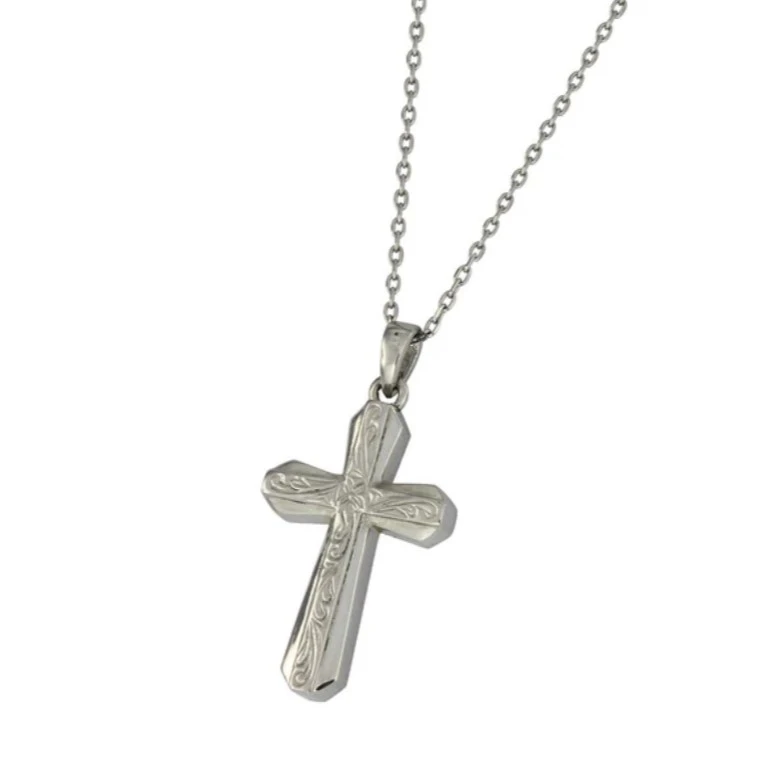 Náhrdelník krížik z chirurgickej ocele. Krížik je z chirurgickej ocele odliaty, z pohľadovej strany ozdobený gravírovaním. Ku krížiku patrí retiazka z chirurgickej ocele vzor anker dlhý 55cm so zapínaním na karabínu.
