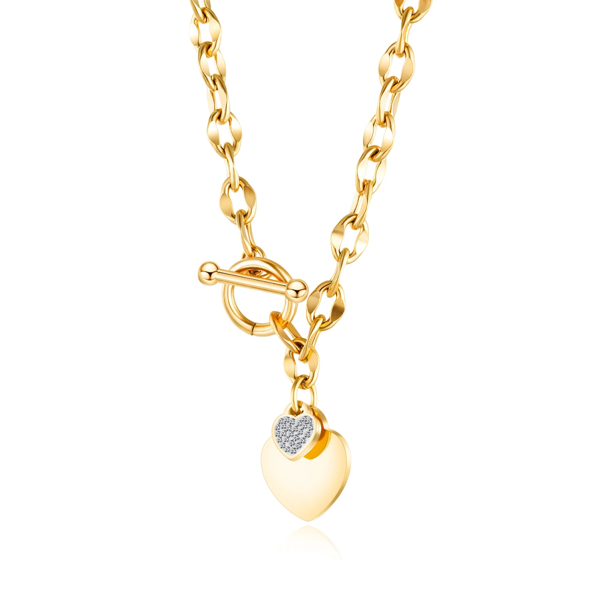 Dámsky náhrdelník srdce z chirurgickej ocele. Povrch náhrdelníku je pozlátený technológiou IP. Retiazka je široký 6,5 mm, dĺžka náhrdelníku 45cm. Rozmer srdiečka so zirkónmi 9x10mm, rozmer väčšieho srdca bez kamienkov 18x16mm. Náhrdelník má T zapínanie.