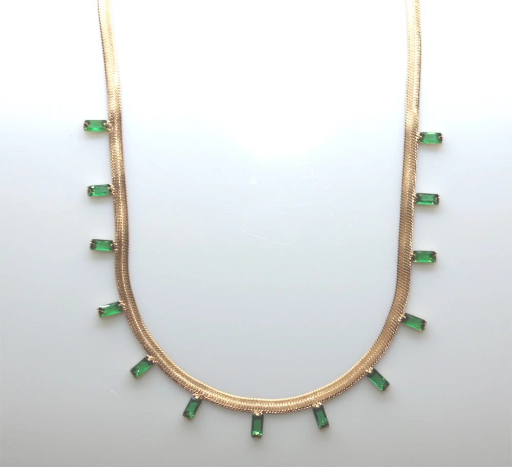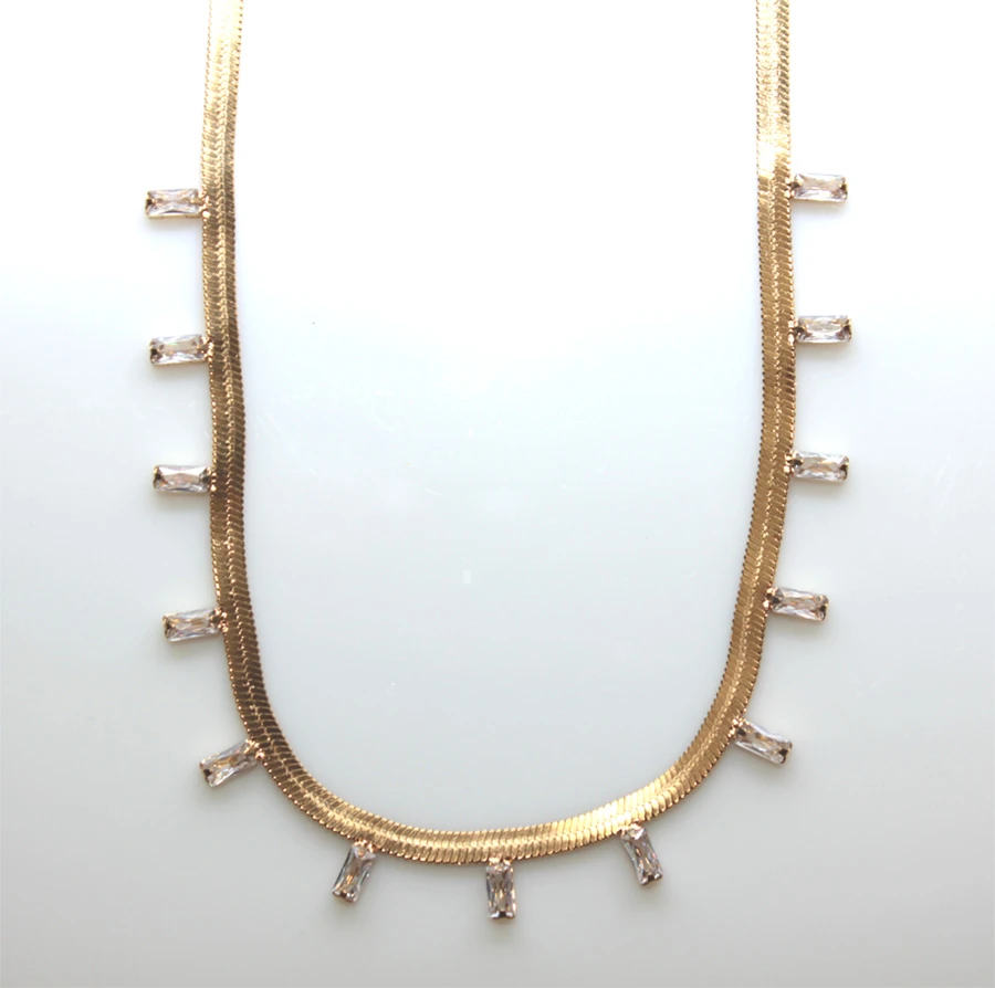 Náhrdelník z chirurgickej ocele zdobený zirkónmi. Povrch náhrdelníka je pozlátený technológiou PVD. Retiazka hádok je široký 4mm, zirkóny, majú rozmer 2,5x5,5mm. Dĺžku náhrdelníka je možné nastaviť v rozmedzí 40-45cm.