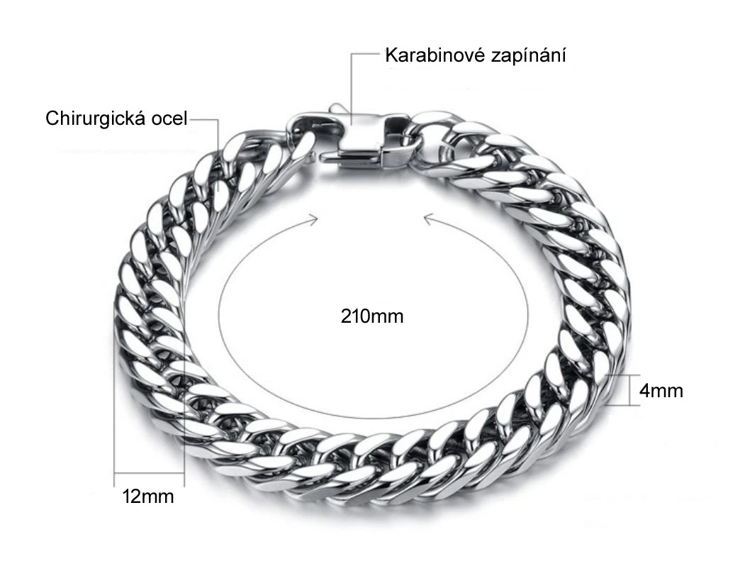 Náramok na ruku z chirurgickej ocele. Povrch náramku je leštený. Náramok sa zapína pomocou karabíny. Dĺžka náramku 21 cm, šírka 10 mm. Na želanie je možné náramok zadarmo skrátiť.