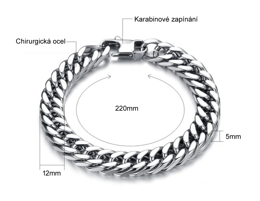Náramok na ruku z chirurgickej ocele. Povrch náramku je leštený. Náramok sa zapína pomocou karabíny. Dĺžka náramku 22 cm, šírka 12 mm. Na želanie je možné náramok zadarmo skrátiť.