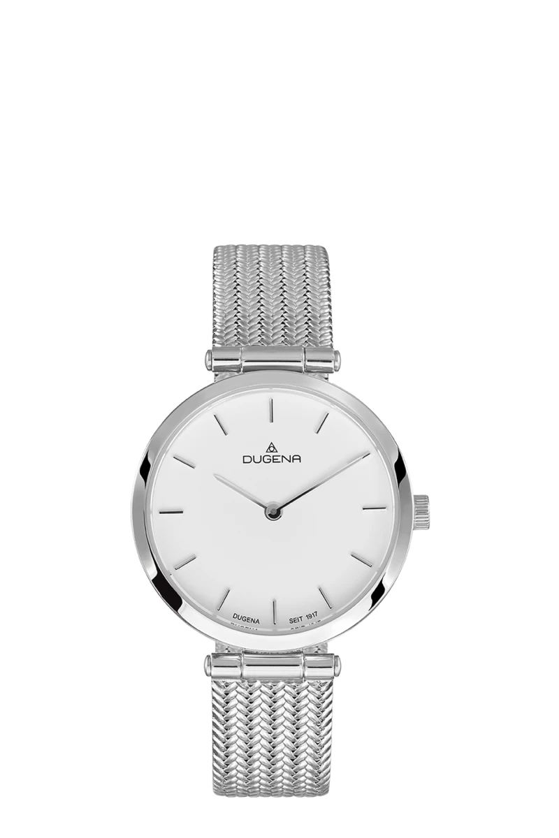 Dámske náramové hodinky Dugena z chirurgickej ocele s milánskym ťahom, sklíčko hodiniek je minerálne. Okrúhly biely ciferník s indexmi. Hodinky sú vybavené hodinovou a minútovou rúčkou. Veľkosť púzdra 32 mm. Chod hodiniek zaisťuje spoľahlivý batériový strojček. Hodinky sú vodotesné na úrovni 3 ATM. Na všetky dámske hodinky Dugena platí záruka v dĺžke 36 mesiacov. Hodinky sú dodávané v darčekovej krabičke s logom.