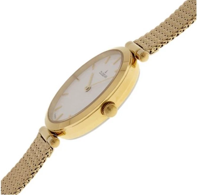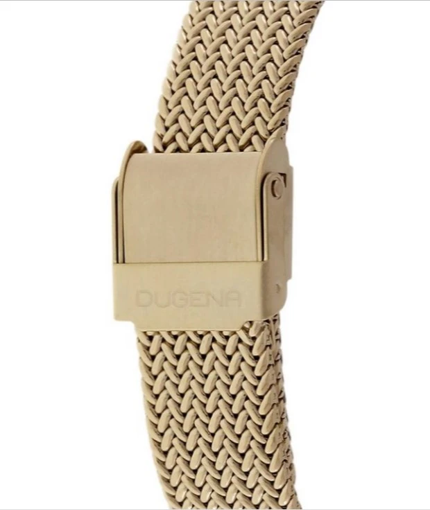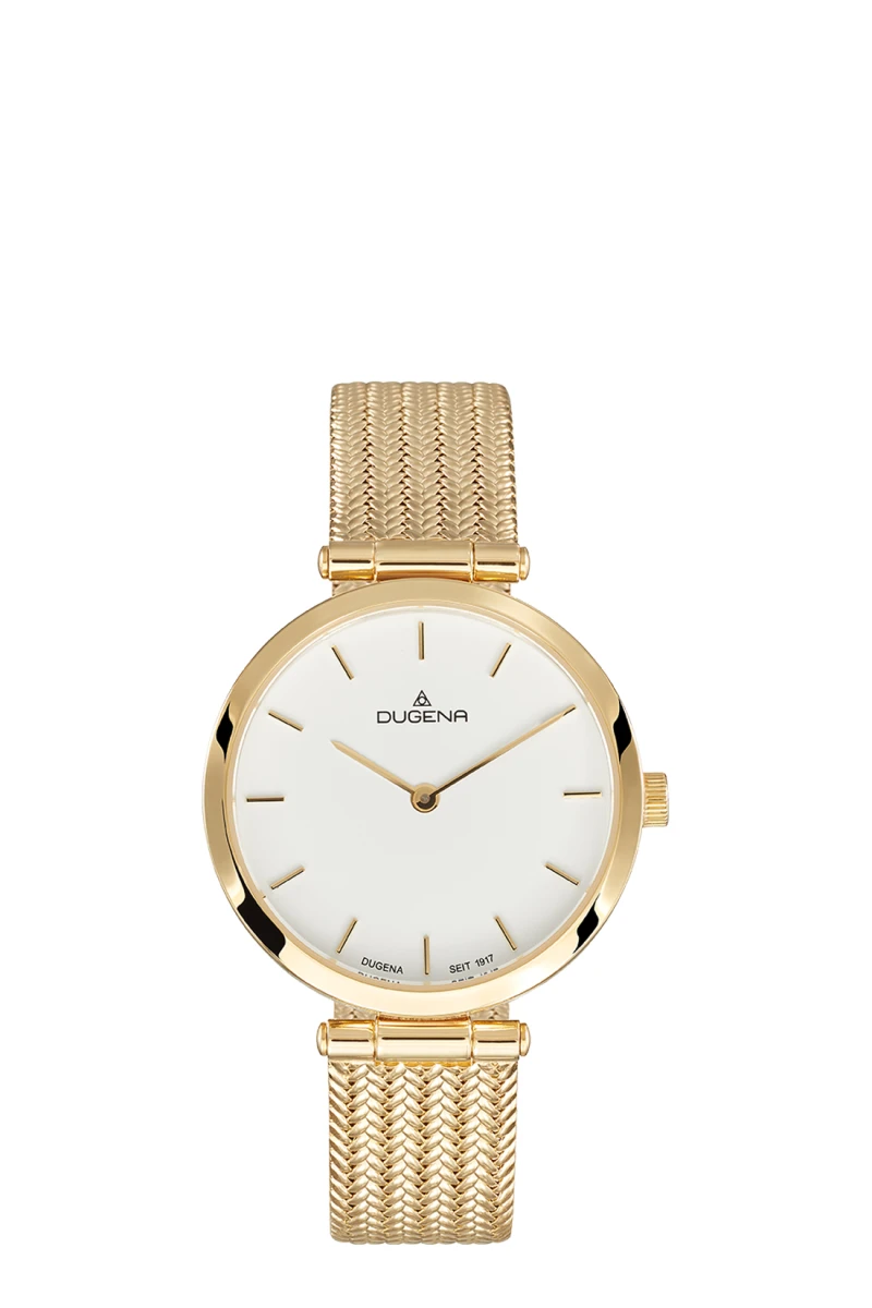 Dámske náramové hodinky Dugena z chirurgickej ocele s milánskym ťahom, sklíčko hodiniek je minerálne. Okrúhly biely ciferník s indexmi. Hodinky sú vybavené hodinovou a minútovou rúčkou. Veľkosť púzdra 32 mm. Povrch hodiniek je pozlátený žltým zlatom technológií PVD. Chod hodiniek zaisťuje spoľahlivý batériový strojček. Hodinky sú vodotesné na úrovni 3 ATM. Na všetky dámske hodinky Dugena platí záruka v dĺžke 36 mesiacov. Hodinky sú dodávané v darčekovej krabičke s logom.