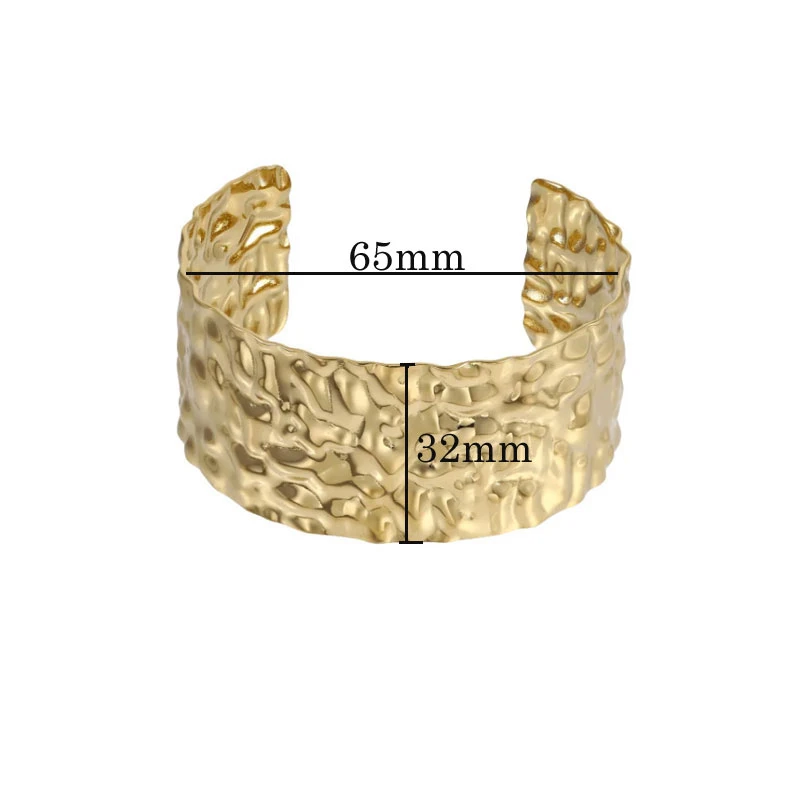 Pevný náramok z chirurgickej ocele s povrchom pozláteným 14k žltým zlatom. Vnútorná šírka náramku 65mm, šírka náramku 32mm. Rozmery nájdete zobrazené na podpornej fotografii.