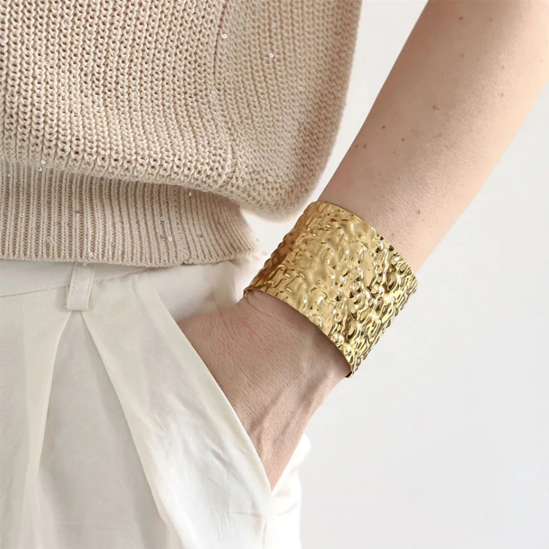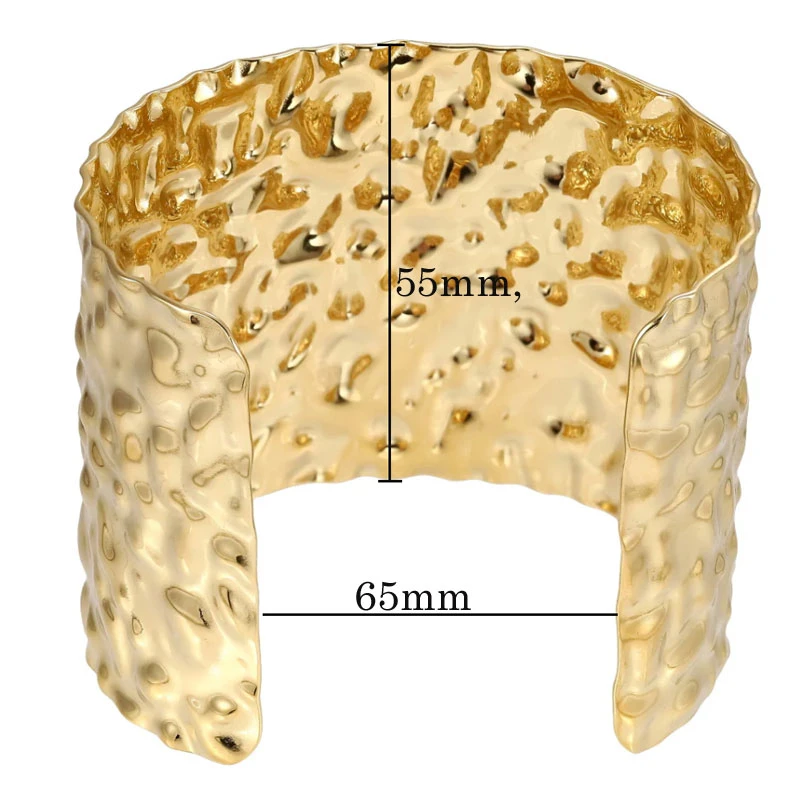 Pevný náramok z chirurgickej ocele s povrchom pozláteným 14k žltým zlatom. Vnútorná šírka náramku 65mm, šírka náramku 55mm. Rozmery nájdete zobrazené na podpornej fotografii.