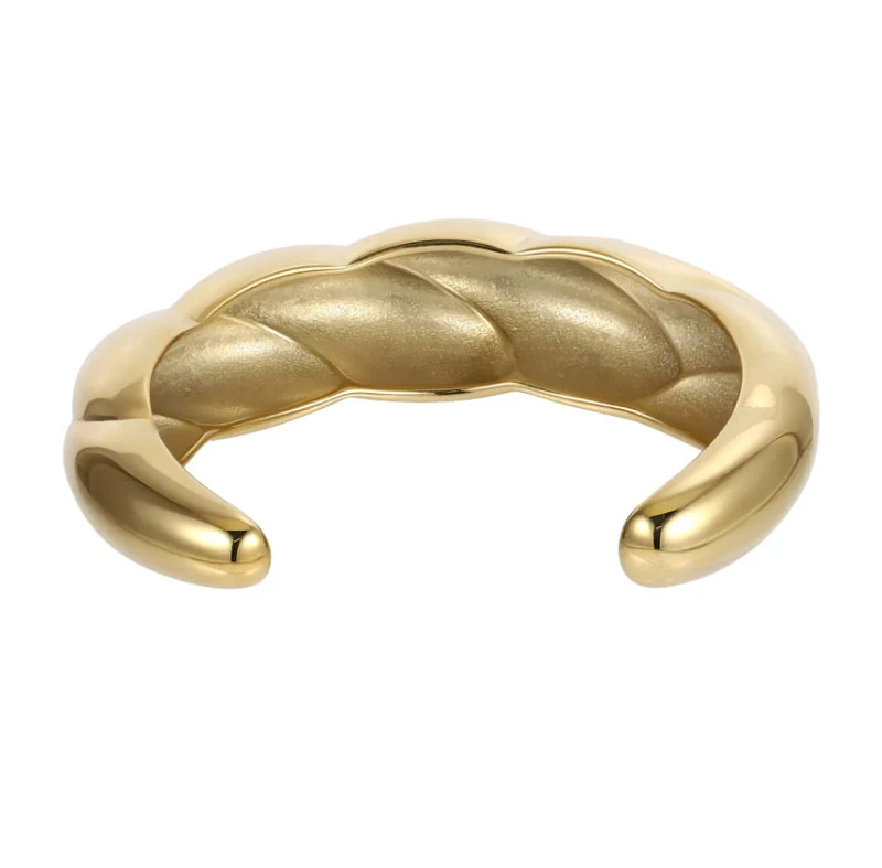 Pevný náramok z chirurgickej ocele s povrchom pozláteným 14k žltým zlatom. Vnútorná šírka náramku 60mm, šírka náramku 20mm, výška 13mm. Rozmery nájdete zobrazené na podpornej fotografii.