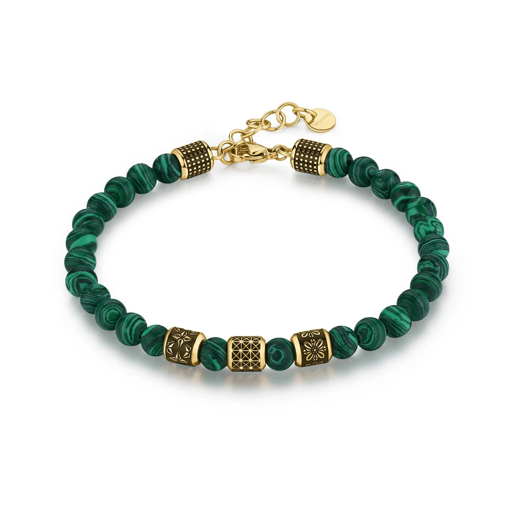 Pánsky náramok na ruku z chirurgickej ocele s malachitovými korálkami. Povrch oceľových častí náramku je pozlátený technológiou PVD a černený smaltovaním. Zapínanie náramku je karabínové, dĺžka náramku 22cm.