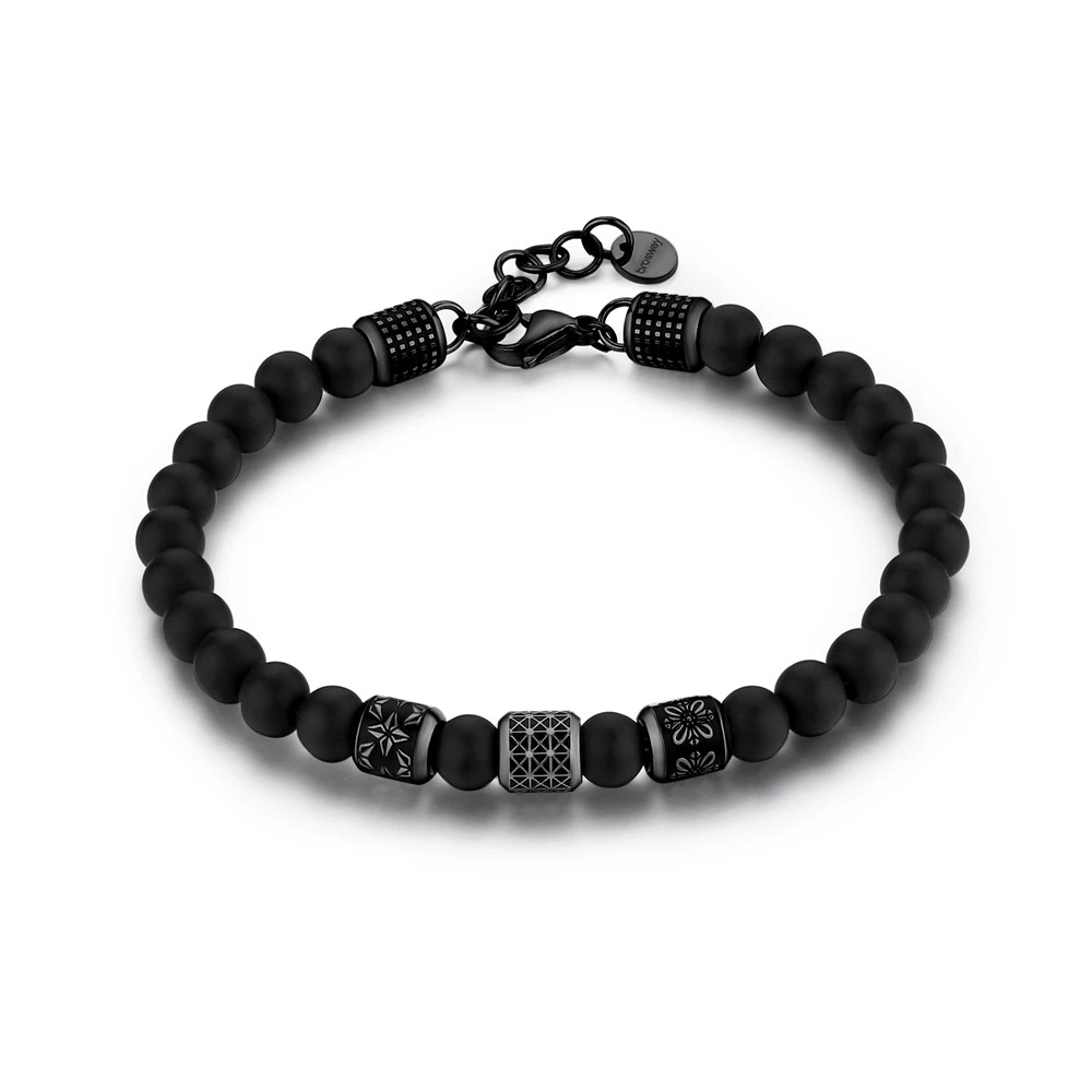 Pánsky náramok z kolekcie Bullet. Náramok tvorí korálky z onyxu a chirurgickej ocele 316l. Oceľové korálky, zakončenie náramku a karabínky majú povrch upravený technológiou PVD na farbu pištoľovej šedi. Dĺžka náramku 21cm.