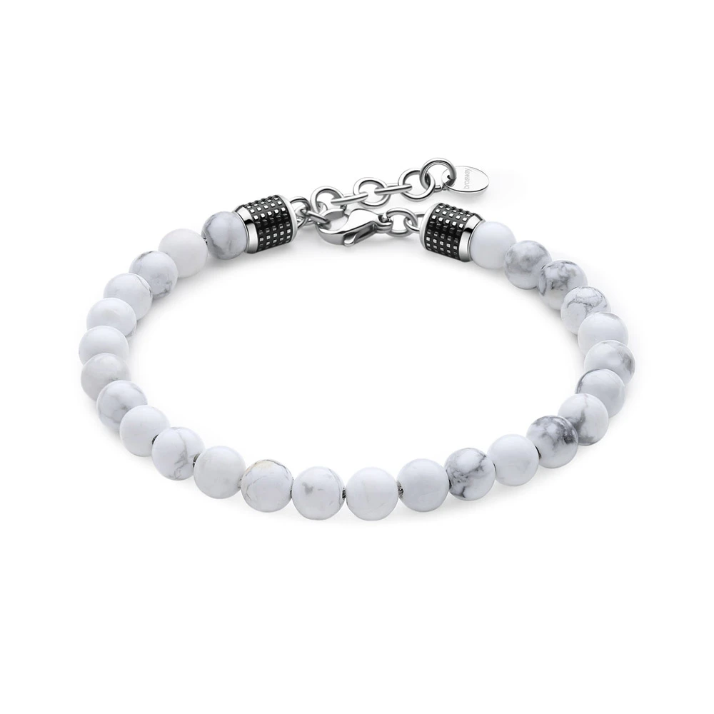 Náramek z chirurgické oceli 316l a bieleho howlitu. Ocelové konce náramku jesou ozdobené čiernym smaltovaním. Náramek je dlhý 21cm.