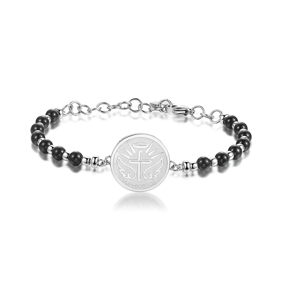 Náramok z chirurgickej ocele z kolekcie Chakra s príveskom s rytinou PROTECT ME doplnený prírodnými kameňmi. Povrch náramku je leštený. Dĺžka 18,5 cm. Zapínanie náramku je karabínové.