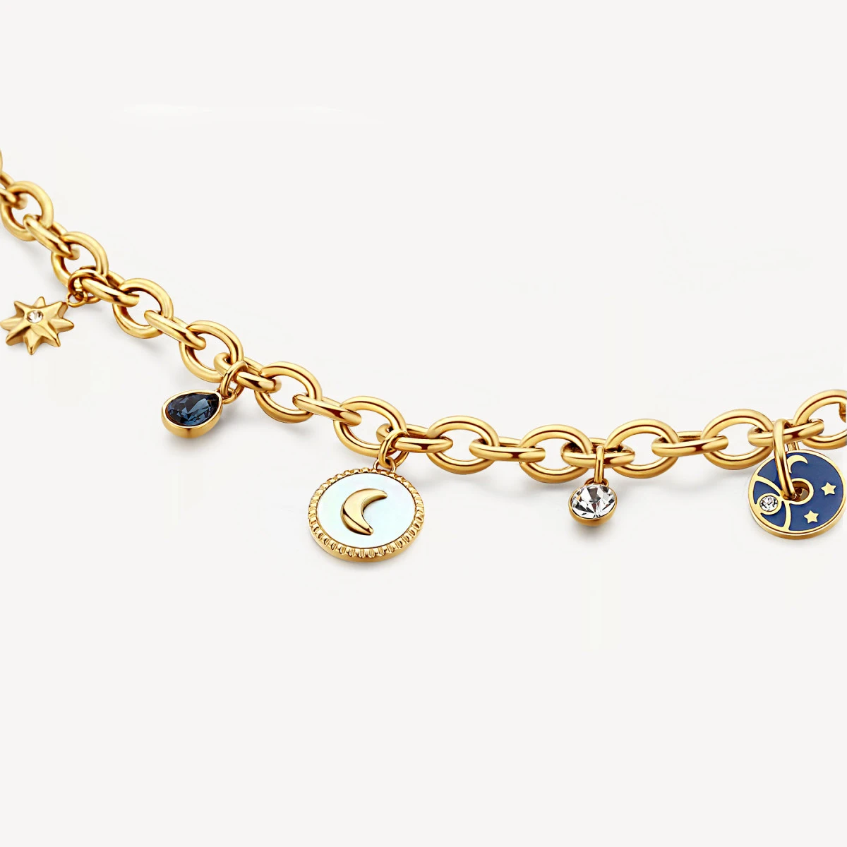 Náramok Brosway z kolekcie CHAKRA zdobený smaltovanými príveskami a kryštálmi je vyrobený z chirurgickej ocele a je pozlátený technológiou PVD. Šperky vyrobené z chirurgickej ocele sú odolné proti poškriabaniu, nemenia farbu, neoxidujú, nevyvolávajú alergické reakcie ani nereagujú na pot a prach. Zapínanie náramku je na karabínku. Dĺžka náramku je 19 cm.