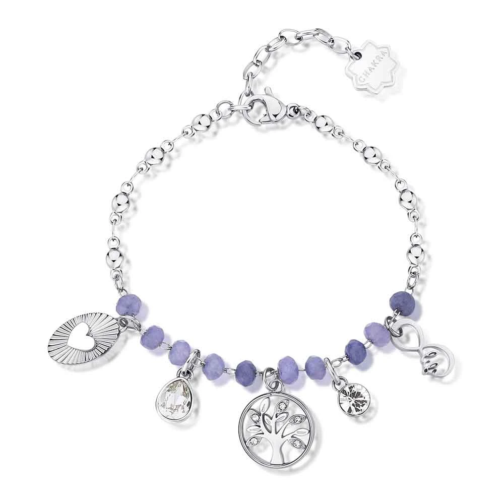 Dámsky náramok z kolekcie Chakra vyrobený z chirurgickej ocele 316L. Povrch náramku je leštený. Náhrdelník je ozdobený korálkami z minerálu chalcedónu a žiarivými kryštálmi. Dĺžka náramku 18cm.