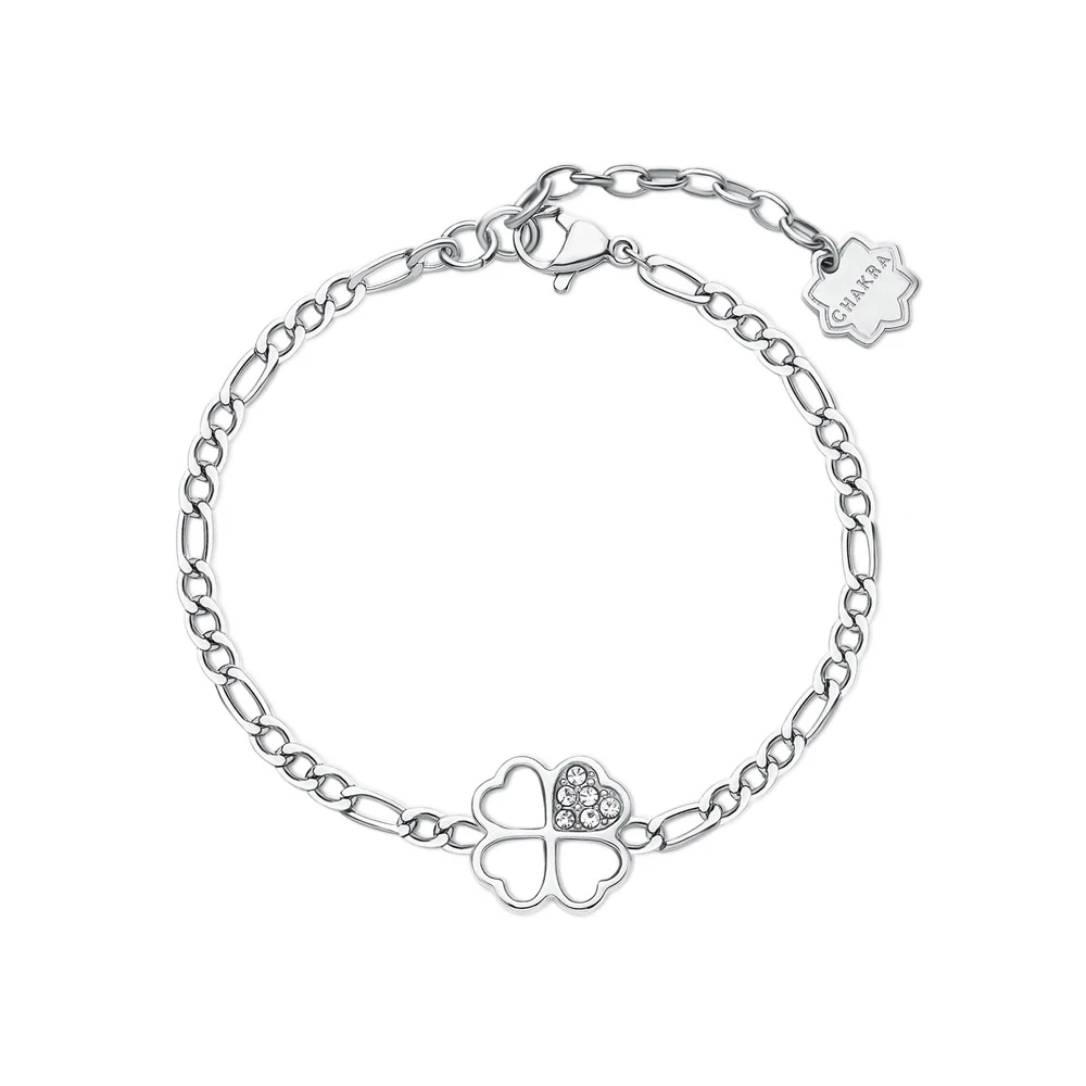 Náramok z chirurgickej ocele z kolekcie Chakra s ozdobou štvorlístka pre šťastie. Povrch náramku je leštený. Náramok zdobia žiarivé kryštály. Dĺžka 18cm. Zapínanie náramku je karabínové.
