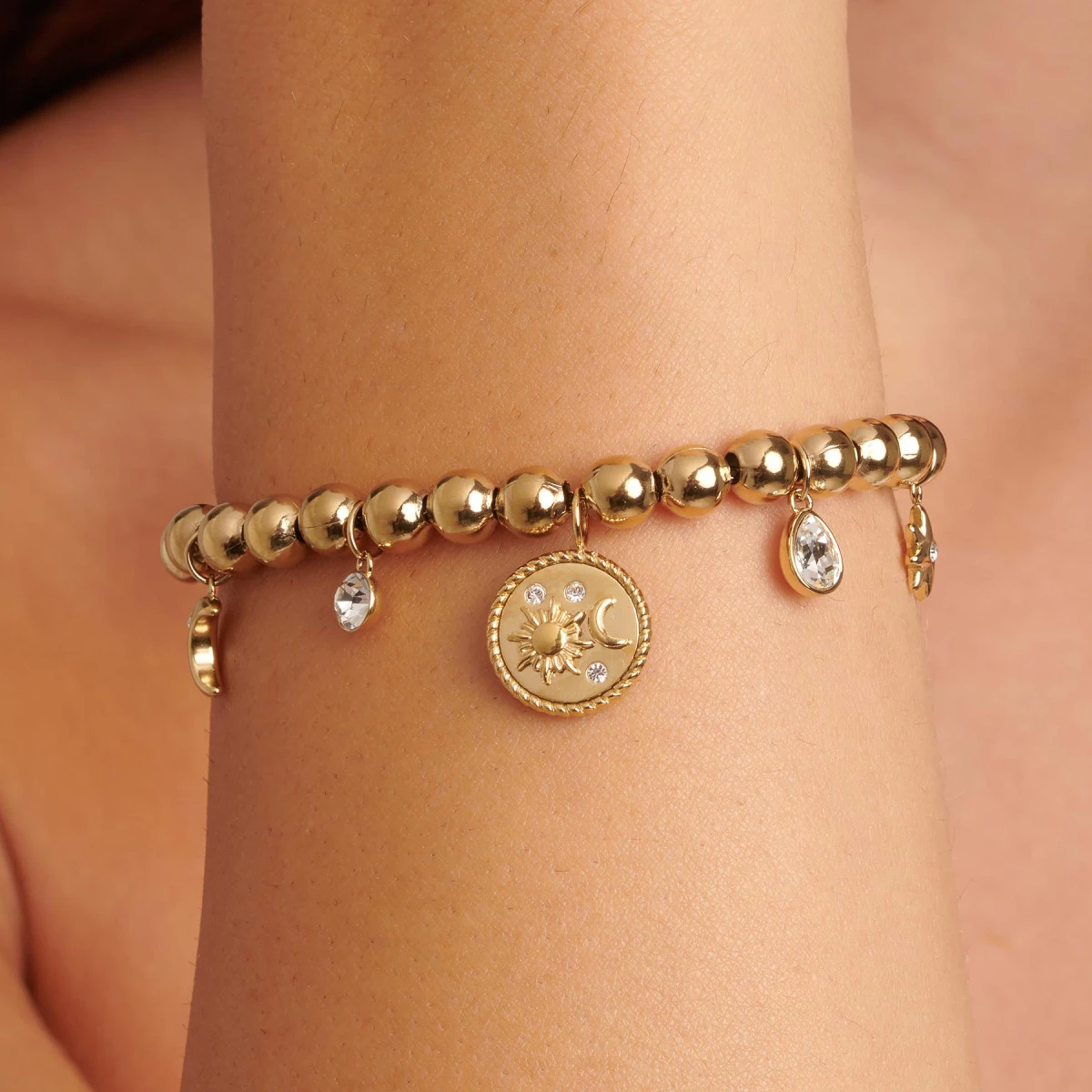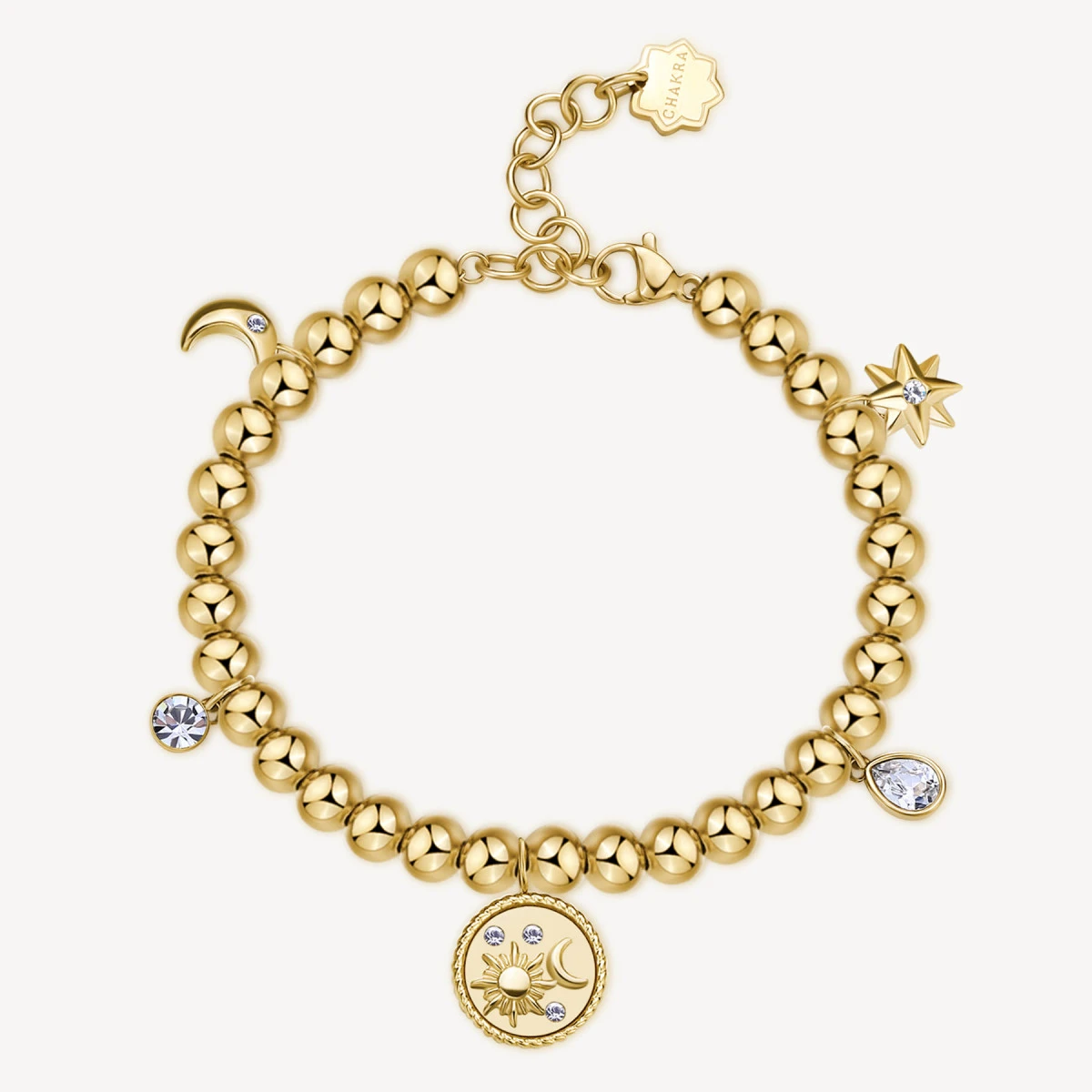 Dámsky náramok z chirurgickej ocele z kolekcie Chakra. Povrch náramku je pozlátený technológiou PVD. Náramok s príveskami je osadený prvotriednymi kryštálmi. Zapínanie náramku je karabínové. Dĺžka náramku 20cm.