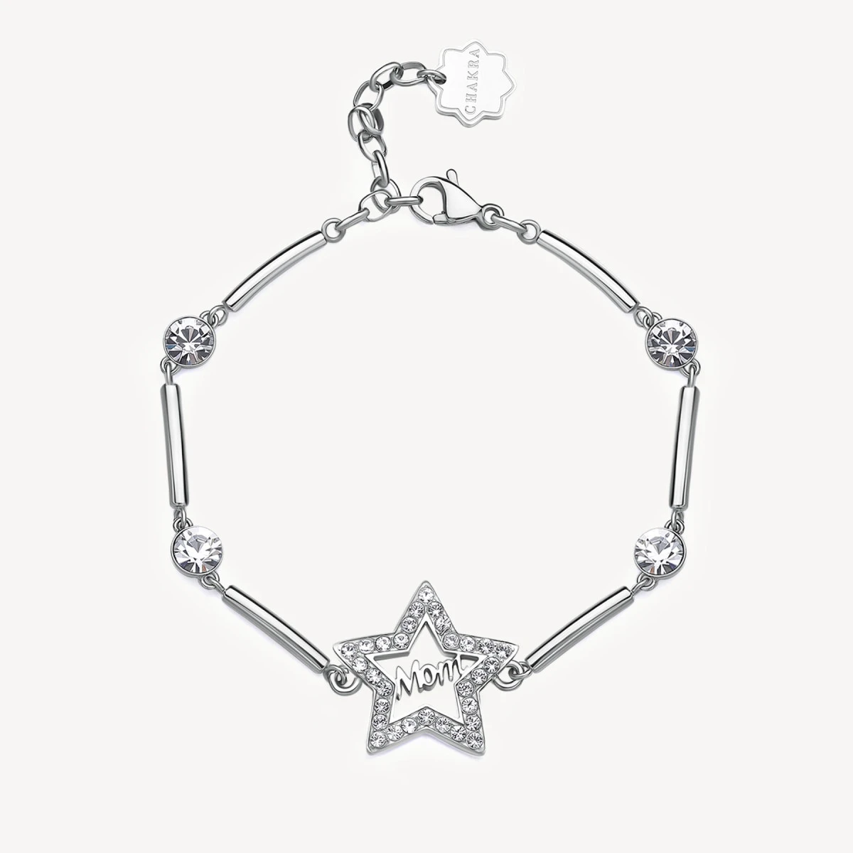 Dámsky náramok z chirurgickej ocele z kolekcie Chakra s príveskom hviezdy a nápisom MOM s prvotriednymi kryštálmi. Povrch náramku je leštený, zapínanie je karabínové. Dĺžka náramku 18,5 cm.