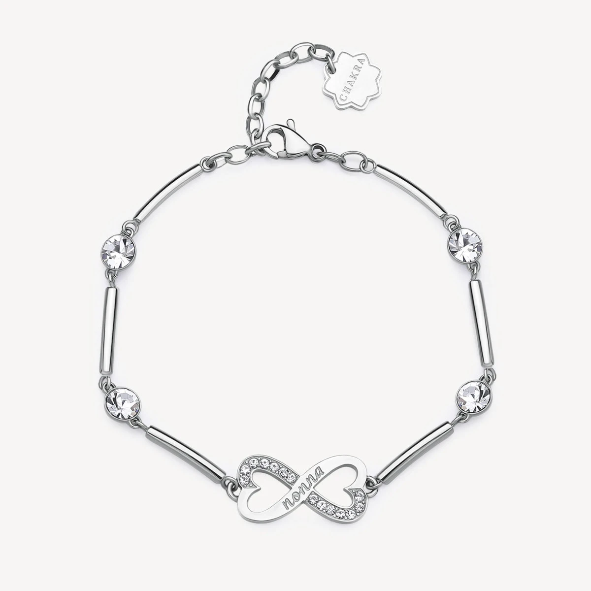 Dámsky náramok z chirurgickej ocele z kolekcie Chakra s príveskom nekonečna a prvotriednymi kryštálmi. Povrch náramku je leštený, zapínanie je karabínové. Dĺžka náramku 18,5 cm.